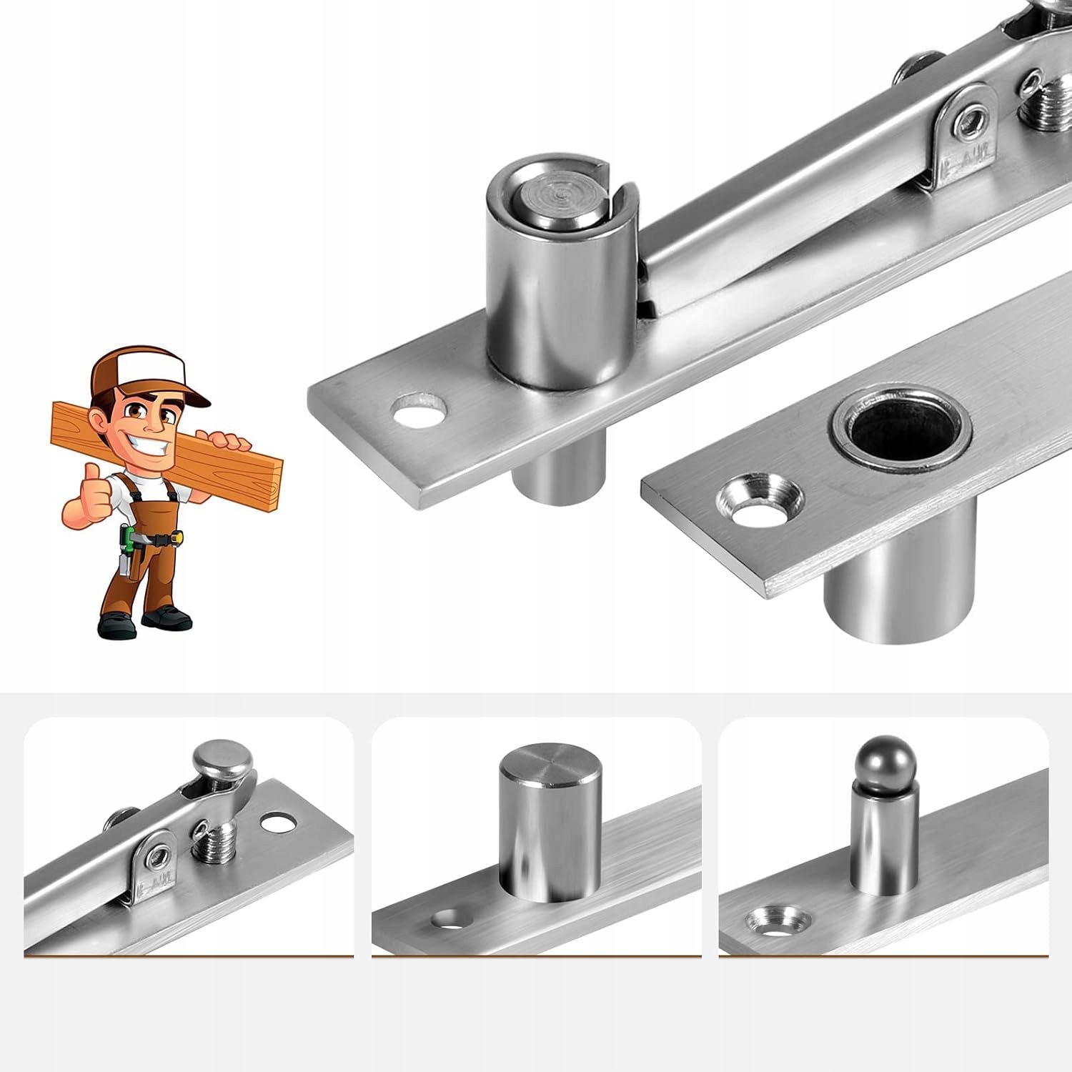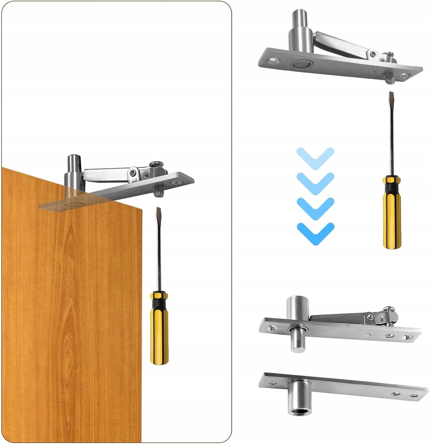 ➤【Простая установка】 Верхний штифт оснащен выдвижным штифтом, что обеспечивает быструю и простую установку. Скрытая поворотная дверная петля Pivot может быть установлена на верхнем уровне двери и прикреплена к проему на поверхности двери.