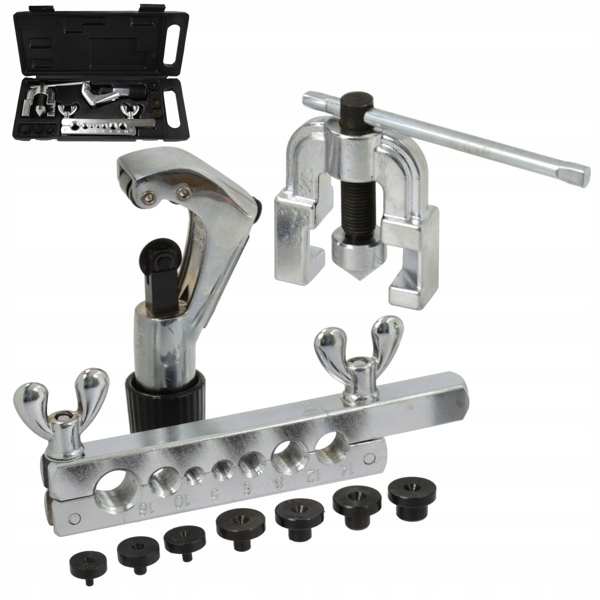 Комплект для опрессовки тормозных и топливных магистралей. Подходит для резки и расширения медных, латунных и алюминиевых трубок и кабелей со стенками толщиной до 1 мм.