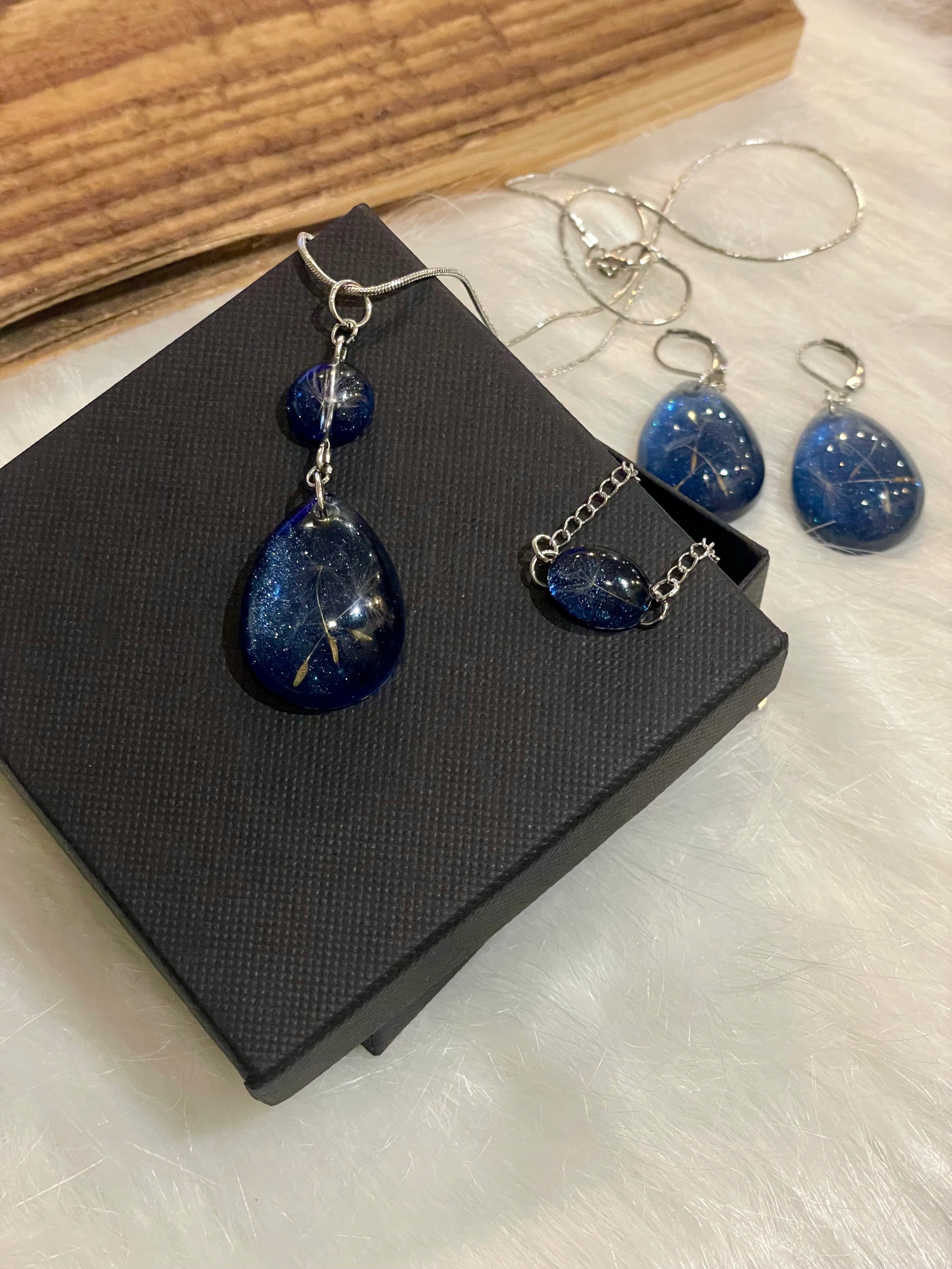 Ручная работа из эпоксидной смолы, комплект с вставленными одуванчиками на мерцающем черном фоне.