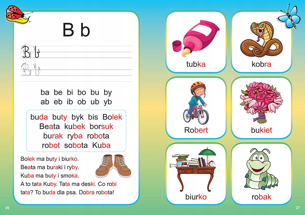 В книге представлены буквы, слоги, слова, предложения и целые слоговые прочтения, где слоги дополнительно выделены цветом. Мы можем попрактиковаться в написании прописных и строчных букв. Обводим только первые буквы, дальше задача усложняется и ее приходится писать самостоятельно (...) При работе с книгой, чем дальше, тем более развиты слова и предложения. Благодаря этому дети развивают и закрепляют свои навыки (...) Букварь очень понравился Габи. Он рад сесть и поработать с ним.