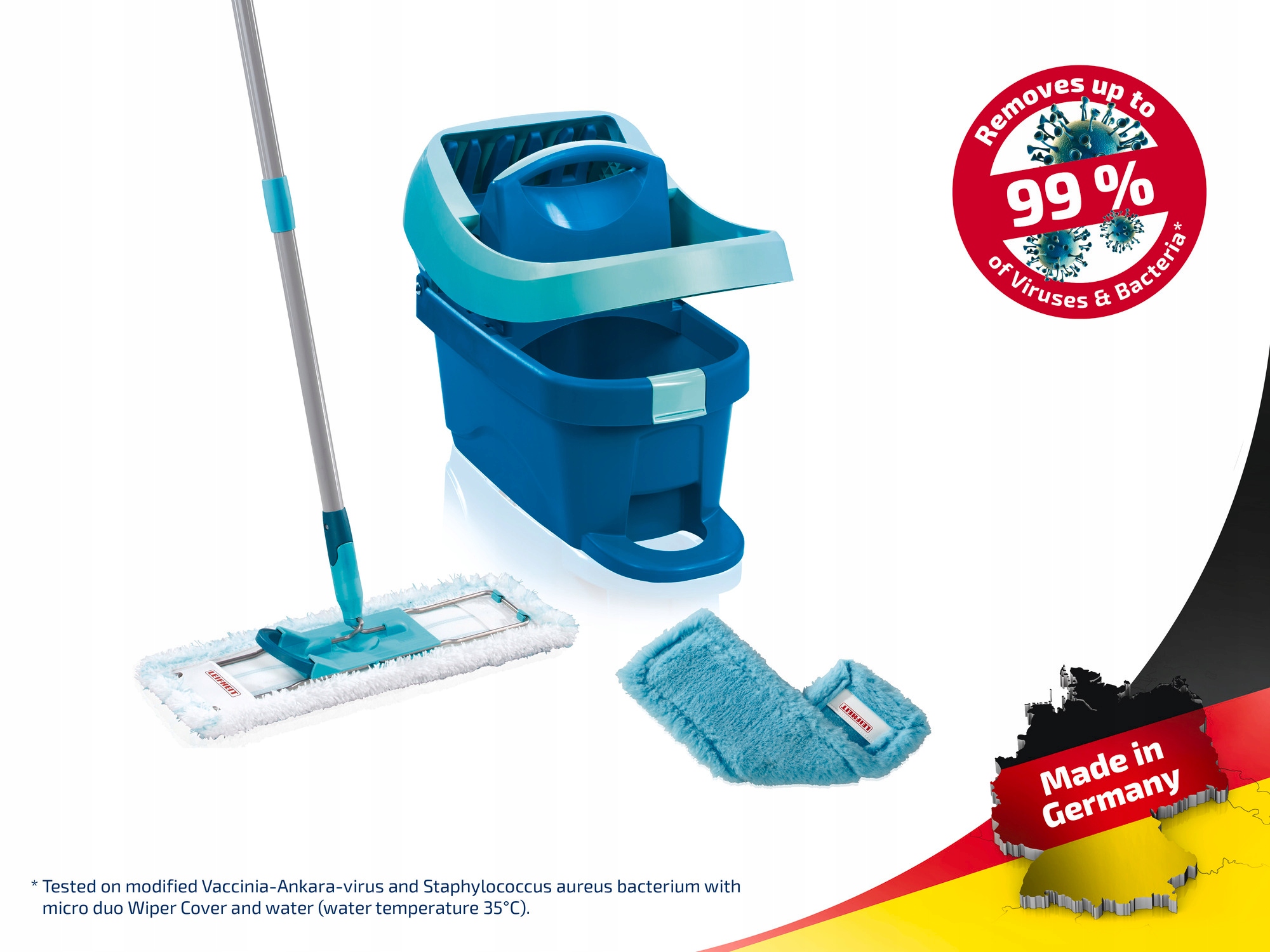 - Постоянные накладывание швабры: микро дуэт можно промыть в стиральной машине до 400 раз при температуре при 60 ° C, дряблый Stratic можно промыть до 100 раз при температуре при 40 ° C. Вирус коровь и бактерии золотистого стафана с использованием микроуо и водного перекрытия, температура воды 35 ° C).