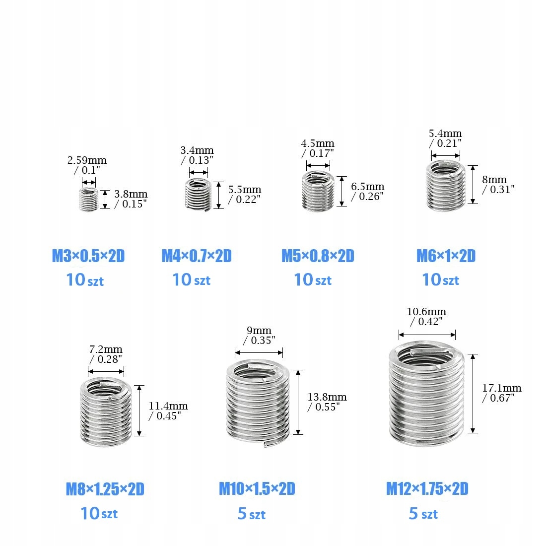 - Пружины для ремонта резьбы: вставки размеров M3, M4, M5, M6, M8, M10, M12
