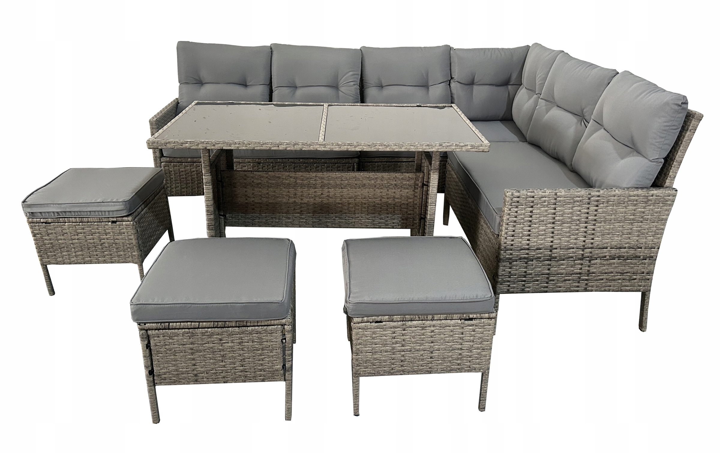 Он идеально смотрится на террасе и на лужайке. Его можно использовать как гарнитур или угловой диван. Стол со столешницей из закаленного стекла. Техноротанг устойчив к погодным условиям и ультрафиолету. Наволочки из пропитанного материала, снимаются на молнию - можно стирать.