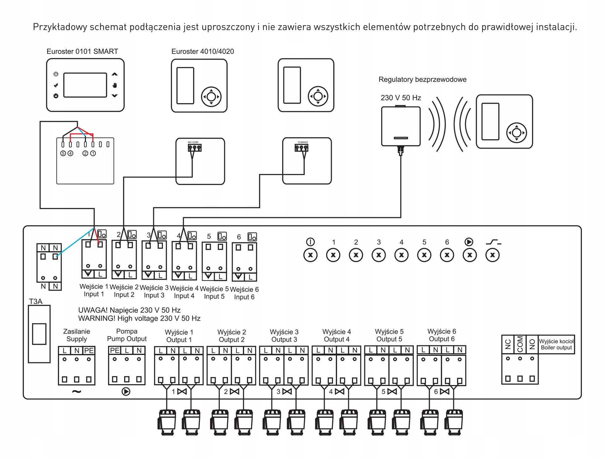 Euroster T6 – универсальный проводной модуль управления распределителями систем водяного теплого пола. Он независимо управляет максимум 24 исполнительными механизмами, установленными на напольном распределителе, и имеет возможность отключать котел и циркуляционный насос, если отключены все контуры отопления. Модуль работает с проводными комнатными регуляторами Euroster и нормально закрытыми (NC) электротермическими приводами на 230 В. Euroster T6 позволяет последовательно подключать модули для управления обширной системой отопления.