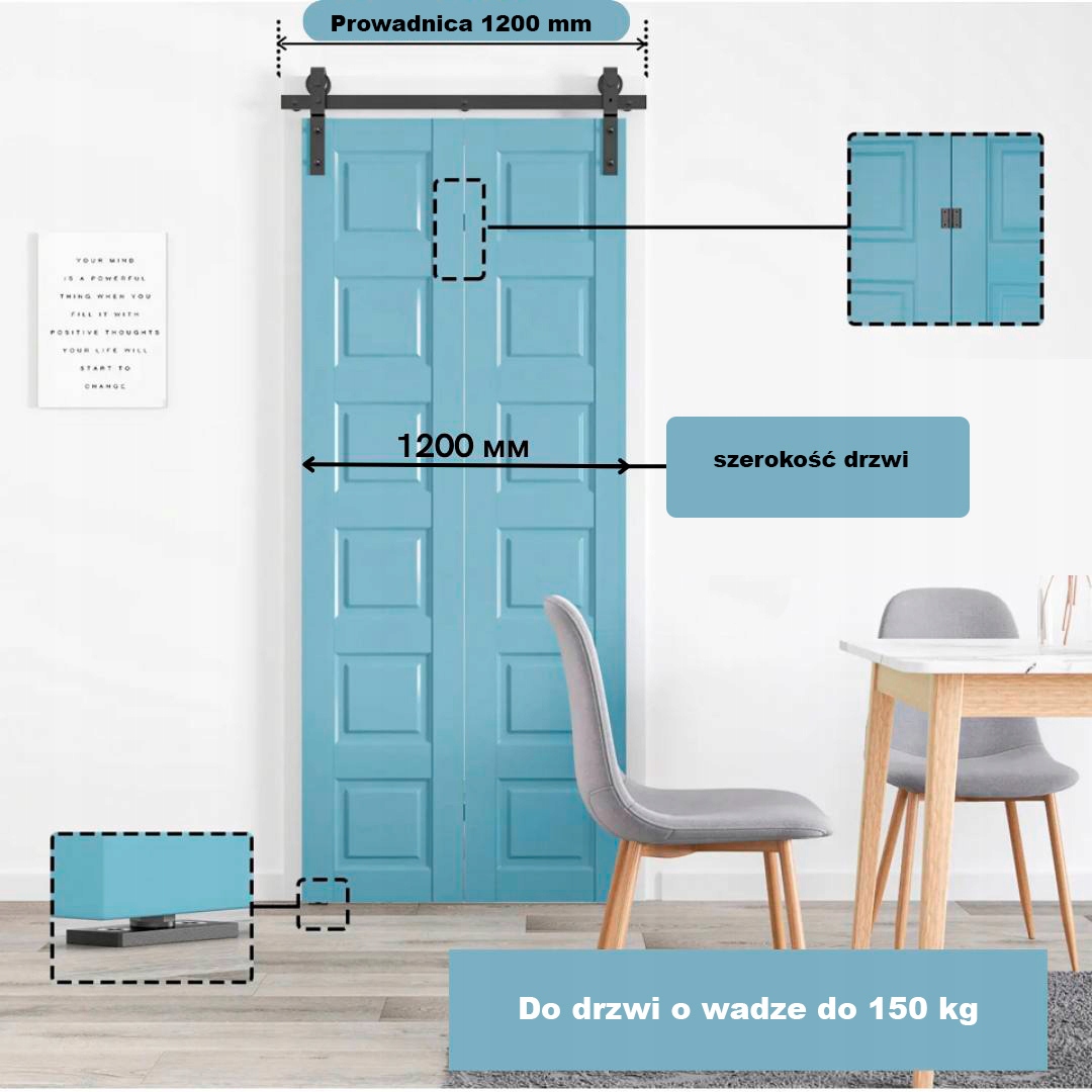 - Длина ходовой 1,22 метра и идеально подходит для дверей шириной до 1200 мм (каждая створка может быть не более 600 мм).