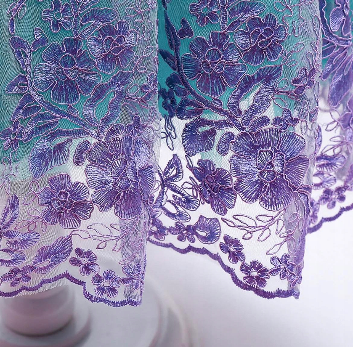 - Низ платья выполнен из тюля с декоративной фиолетовой лентой кружево, низ состоит из четырех слоев, белый тюль отделан фиолетовым кружевом, два слоя зеленого фатина и изумрудная подкладка,