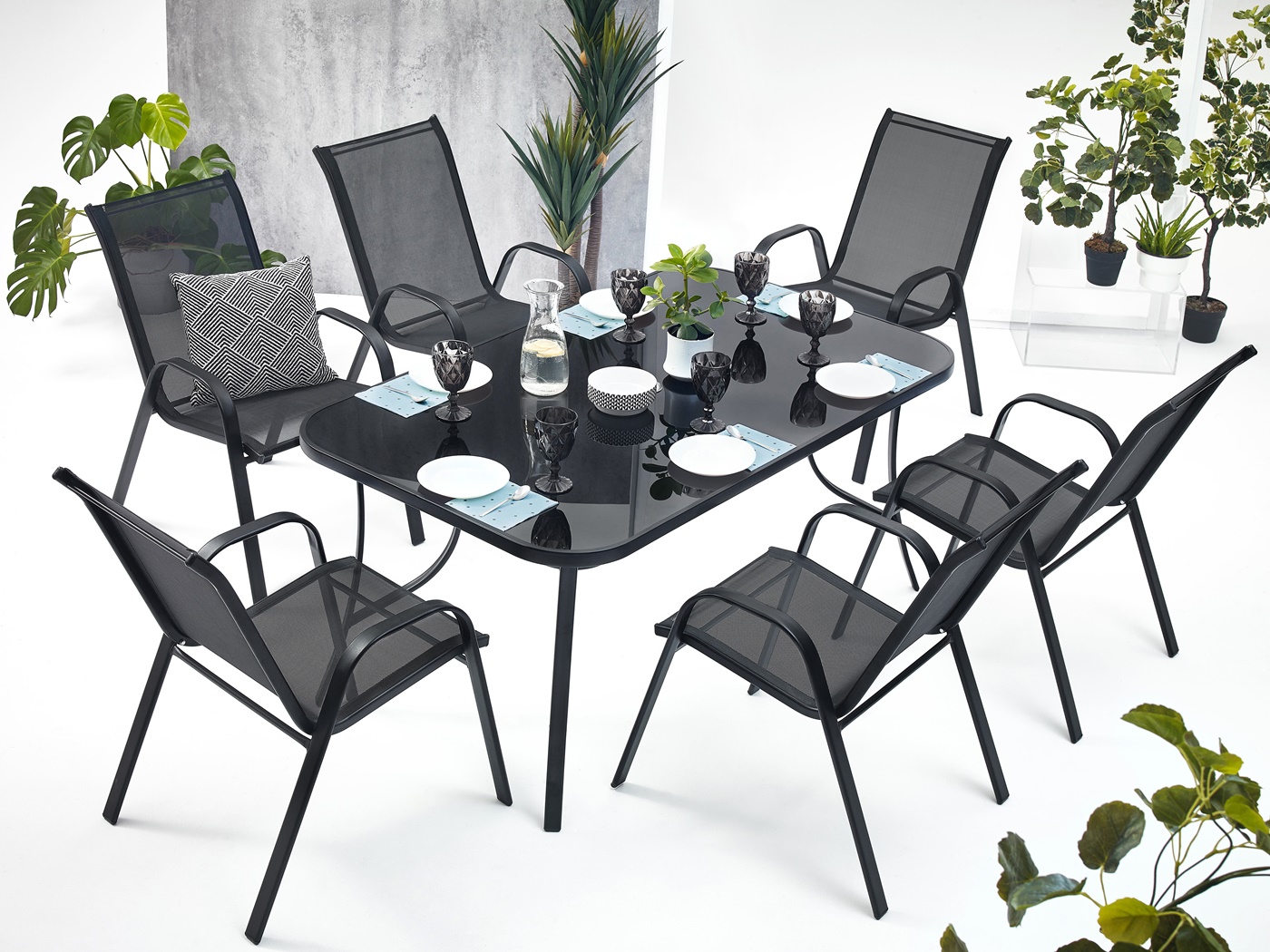 НАБОР САДОВОЙ МЕБЕЛИидеально подходит для вашего сада. Каркас имеет двойное порошковое покрытие, что делает этот продукт идеальным для использования как внутри, так и снаружи помещений. Сиденье и спинка стула имеют черную гибкую текстильную обивку для максимального комфорта. Имеет две боковые спинки. Используемые материалы не требуют частого ухода, устойчивы к погодным условиям и не требуют специальных средств по уходу. Ножки дополнительно оснащены пластиковыми чехлами. Столешница имеет столешницу из черного закаленного стекла. 5 мм, с отверстием для вставки садового зонта.