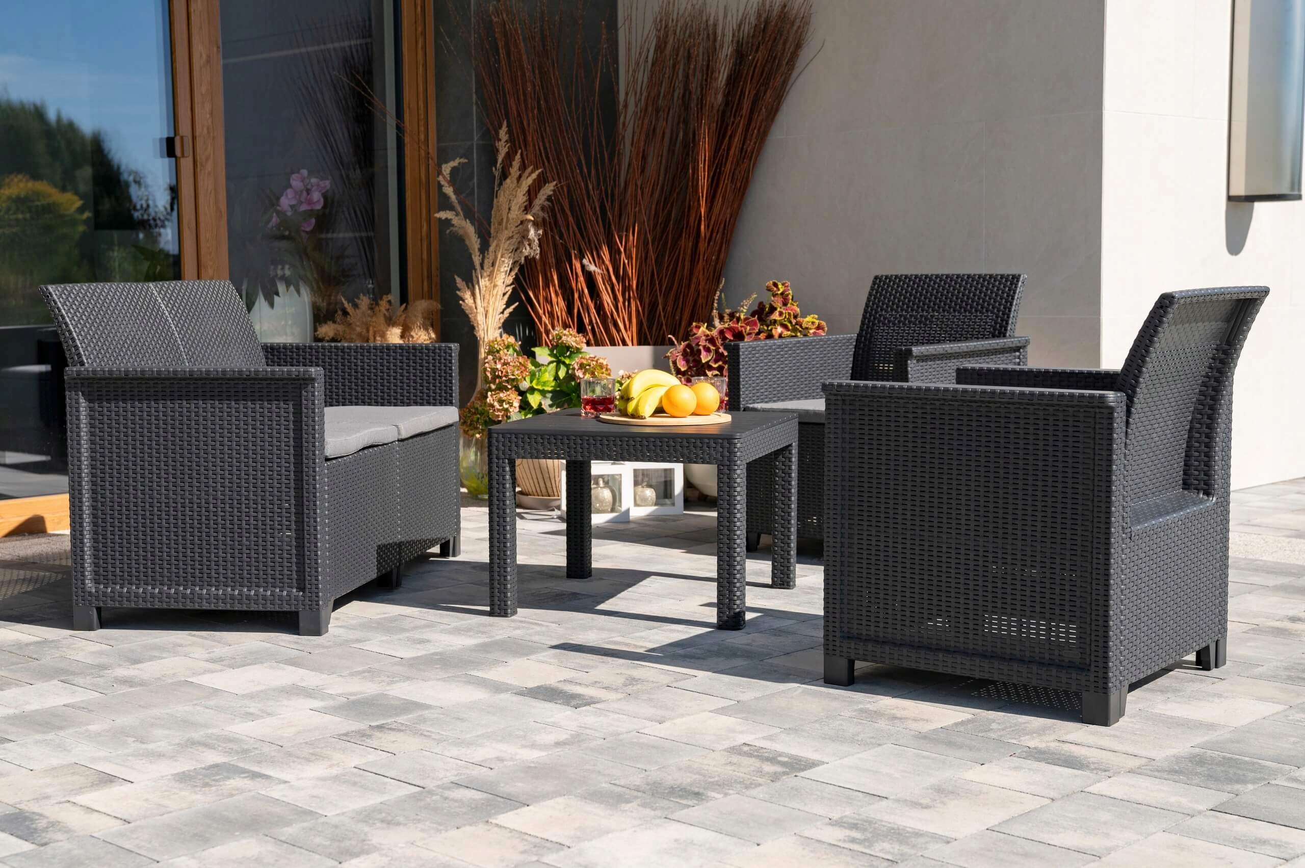 Новый комплект для отдыха Elodie идеально подходит для любой ситуации. С его помощью вы сможете обустроить сад или террасу своей мечты, даже если у вас небольшая площадь. Текстура ротанга и гладкие подлокотники, а также массивная столешница подчеркивают неповторимый характер гарнитура.