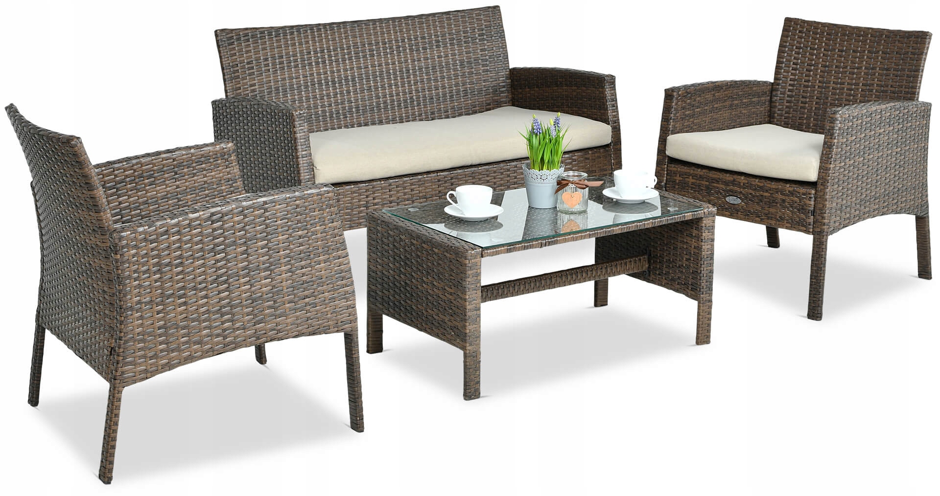 Выберите простой и стильный комплект мебели из техноротанга и расслабьтесь в нем. комфортные условия. Садовый набор состоит из небольшого двухместного дивана, двух кресел и журнального столика. Он обеспечивает комфортное место для встреч и отдыха для четырех человек. Все сделано из прочного пластика и стали. Входящие в комплект подушки делают сиденья мягкими и очень удобными, а их чехлы на молнии можно легко снять и постирать в стиральной машине. Стол усилен элегантной стеклянной панелью из толстого закаленного стекла. Комплект San Marino настолько же практичен, насколько и эстетичен. Технораттанг – материал, известный своей долговечностью и функциональностью. Он устойчив к неблагоприятным погодным условиям и очень легко чистится — любые загрязнения можно удалить влажной тряпкой или мойкой высокого давления. Однако его структура напоминает натуральный материал, поэтому он идеально сочетается с садовой зеленью. Благодаря стальному каркасу мебель очень устойчива и прочна – несомненно, прослужит долго. Этот комплект садовой мебели – лучшее решение для создания универсального и удобного садового уголка на открытом воздухе. Он легко переживет любую погоду и обеспечит вам и вашим гостям желаемый комфорт.