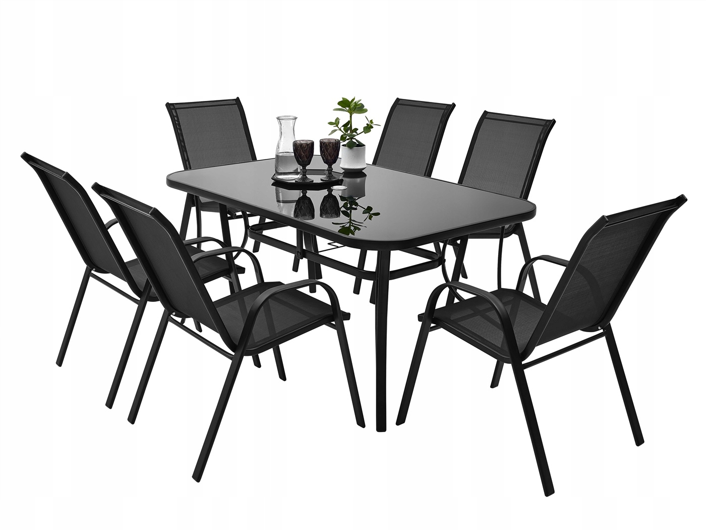 НАБОР САДОВОЙ МЕБЕЛИидеально подходит для вашего сада. Каркас имеет двойное порошковое покрытие, что делает этот продукт идеальным для использования как внутри, так и снаружи помещений. Сиденье и спинка стула имеют черную гибкую текстильную обивку для максимального комфорта. Имеет две боковые спинки. Используемые материалы не требуют частого ухода, устойчивы к погодным условиям и не требуют специальных средств по уходу. Ножки дополнительно оснащены пластиковыми чехлами. Столешница имеет столешницу из черного закаленного стекла. 5 мм, с отверстием для вставки садового зонта.