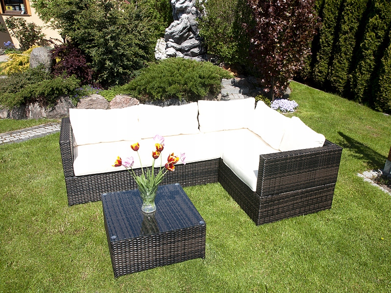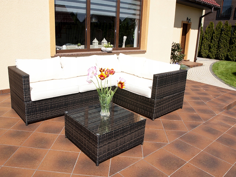 Комплект для отдыха Roma – идеальный выбор для людей, которые ценят простоту, функциональность и современный дизайн. Идеально подходит для кафе, террасы или балкона. Это также идеальное решение для отдыха с чашкой чая в домашнем саду. Угловой диван имеет удобные и толстые подушки, что делает сидение очень комфортным. Плотные подушки оснащены застежкой-молнией, что облегчает чистку материала. Металлический каркас гарантирует устойчивость. Изготовлен из материалов высочайшего качества. Они устойчивы к вредным погодным условиям, а также к УФ-излучению. Легко чистить.