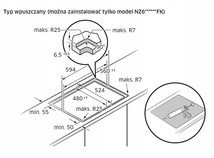 - Размеры выреза ( Ш x В x Г): 560 x 58 x 480 мм
