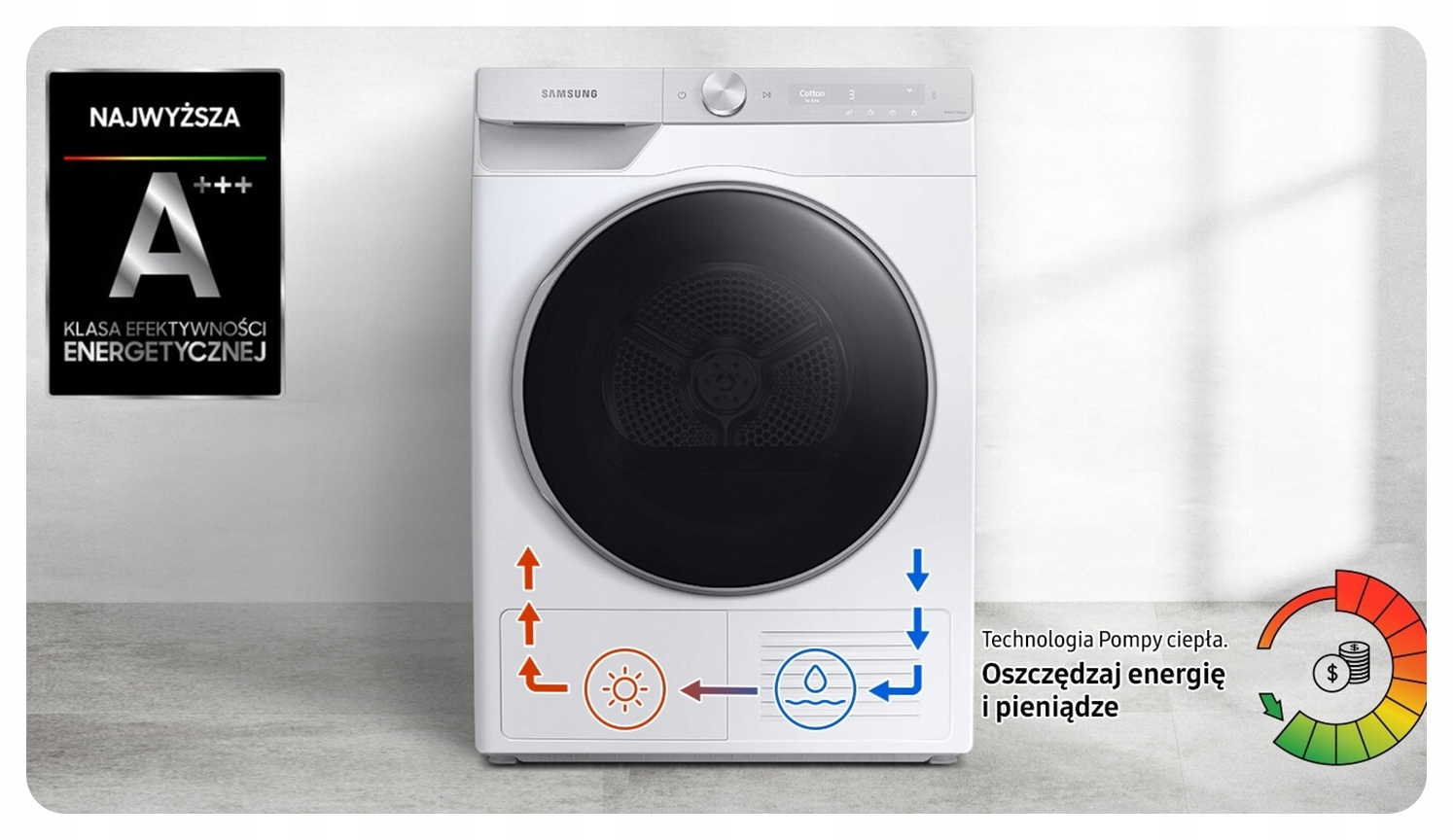 Оплачивайте меньше счетов за электроэнергию и защищайте окружающую среду, используя меньше электроэнергии. Технология теплового насоса обеспечивает энергосберегающий, экономичный и щадящий процесс сушки одежды. Использование хладагента вместо электричества для нагрева воздуха позволило достичь высочайшего класса энергоэффективности А+++.
