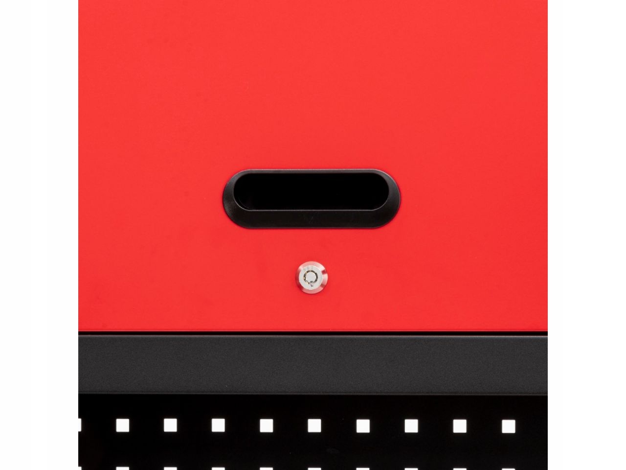 Нижний шкаф имеет 6 ящиков. Общий корпус имеет размеры 65 х 43 х 80 см. 4 ящика меньшего размера и имеют размеры 54 х 38 х 8 см. Два больших ящика имеют размеры 54 х 38 х 16,5 см. Ящики имеют центральный замок, поэтому в них можно безопасно хранить инструменты.