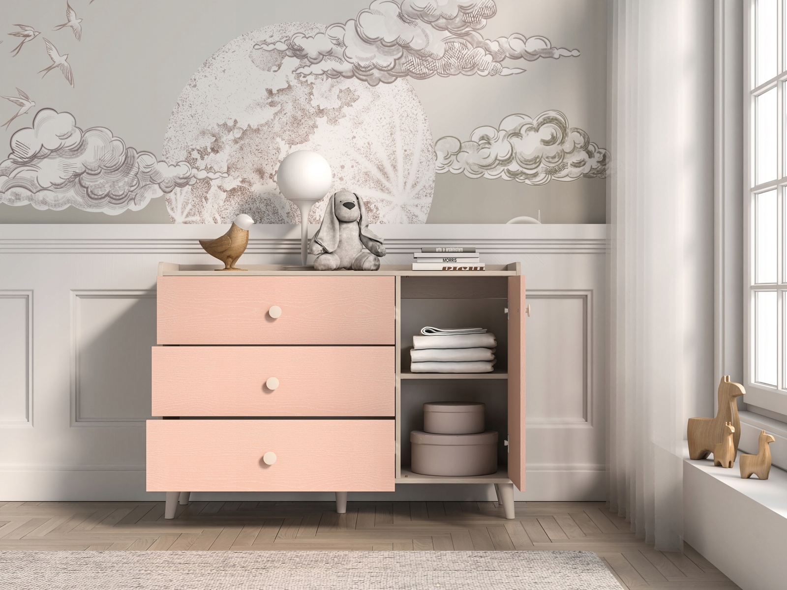 Детский комод Mevel розового цвета – функциональный и эстетичный предмет мебели, идеально подходящий для комнаты самой маленькой. Изготовлен из прочного, устойчивого к царапинам и влаге ламинированного картона, с дополнительным усилением кромок кромкой ABS, обеспечивающей высокую устойчивость к механическим повреждениям. Комфорт использования повышают ящики полного выдвижения с усиленным дном, позволяющие хранить более тяжелые предметы, а также бесшумная система закрывания. Комод также имеет запираемую нишу и просторную верхнюю часть, которая идеально подходит в качестве места для украшений, ночника или детских сувениров.