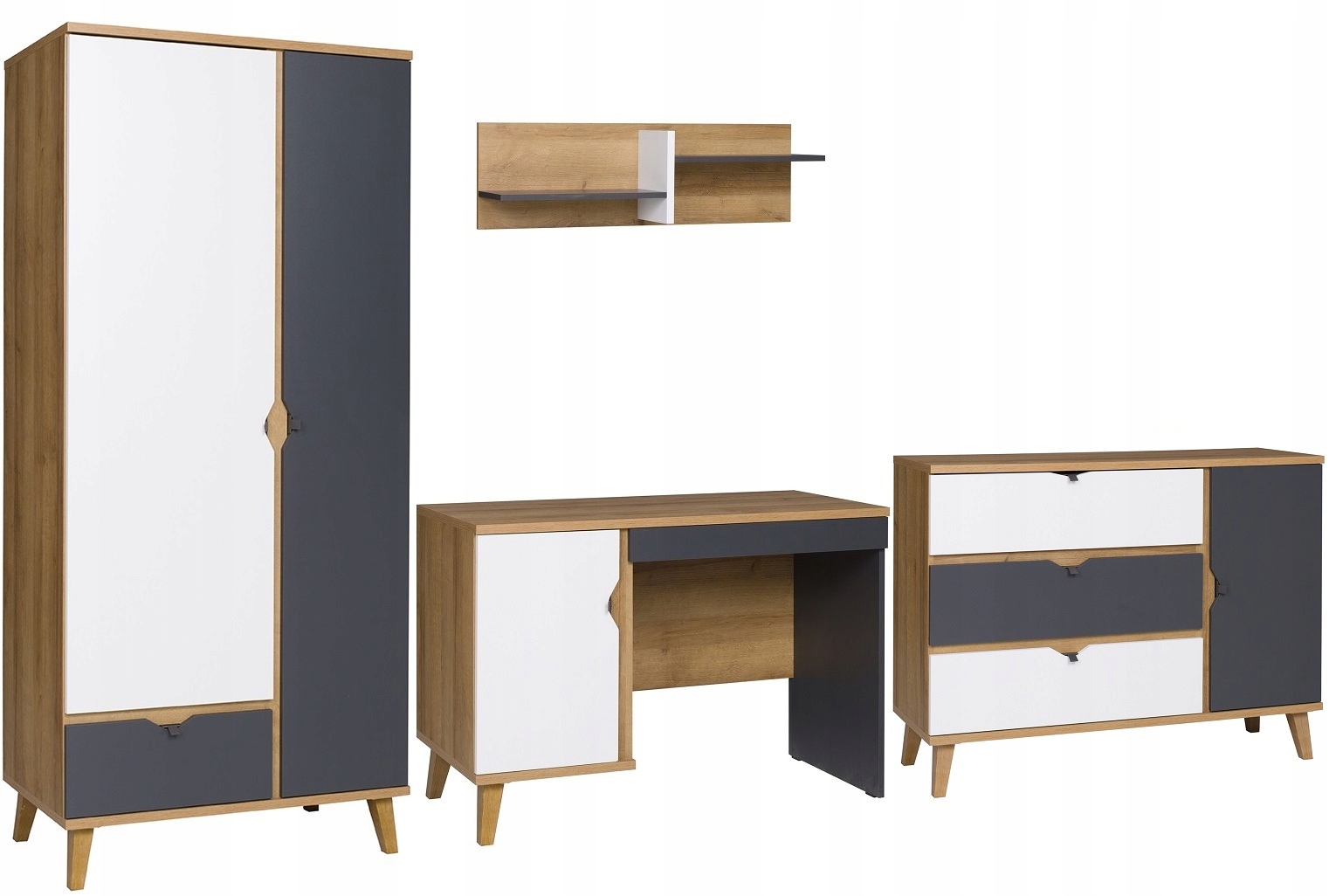 В состав системы входят: шкаф, полки, комоды, тумба под телевизор, письменный стол, тумбочка, кровать, полка.