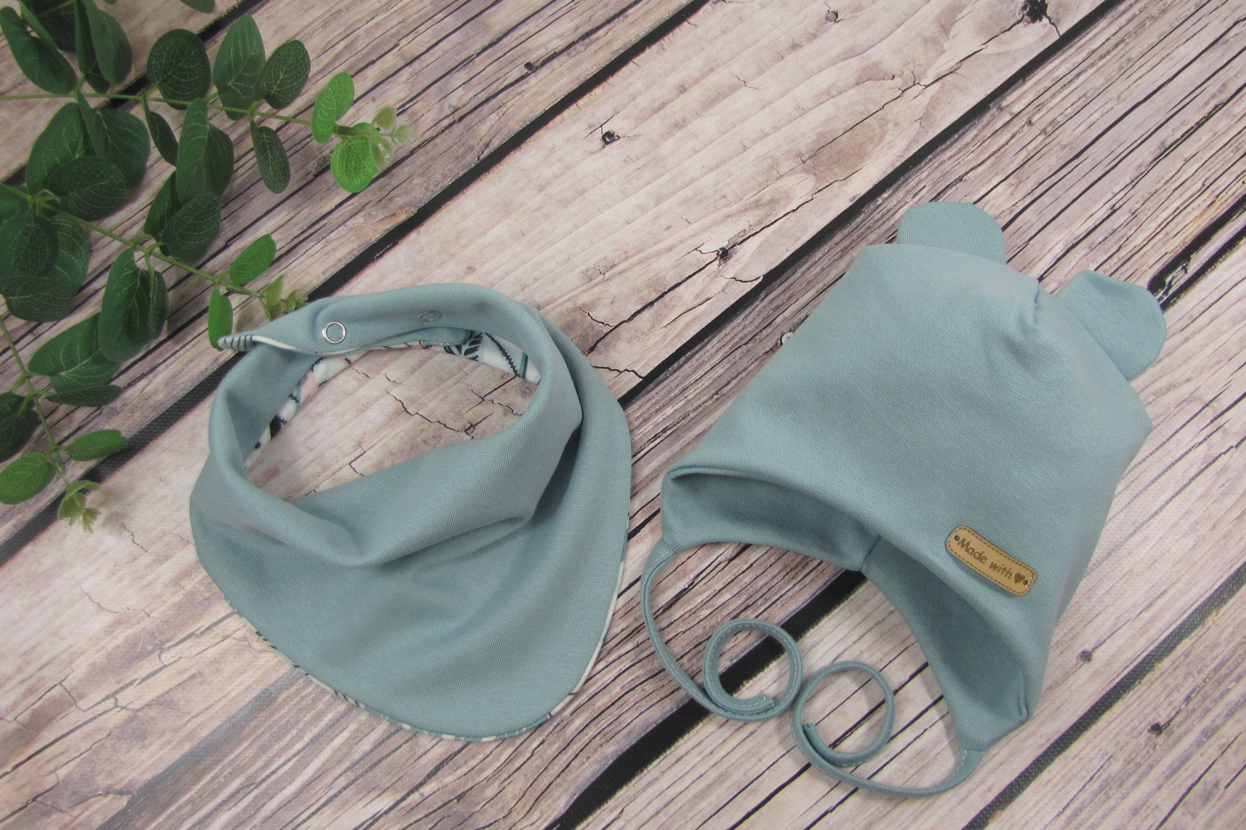 - шарф двухслойный, одна сторона пыльно-синего цвета, другая — цвета медведя коалы
