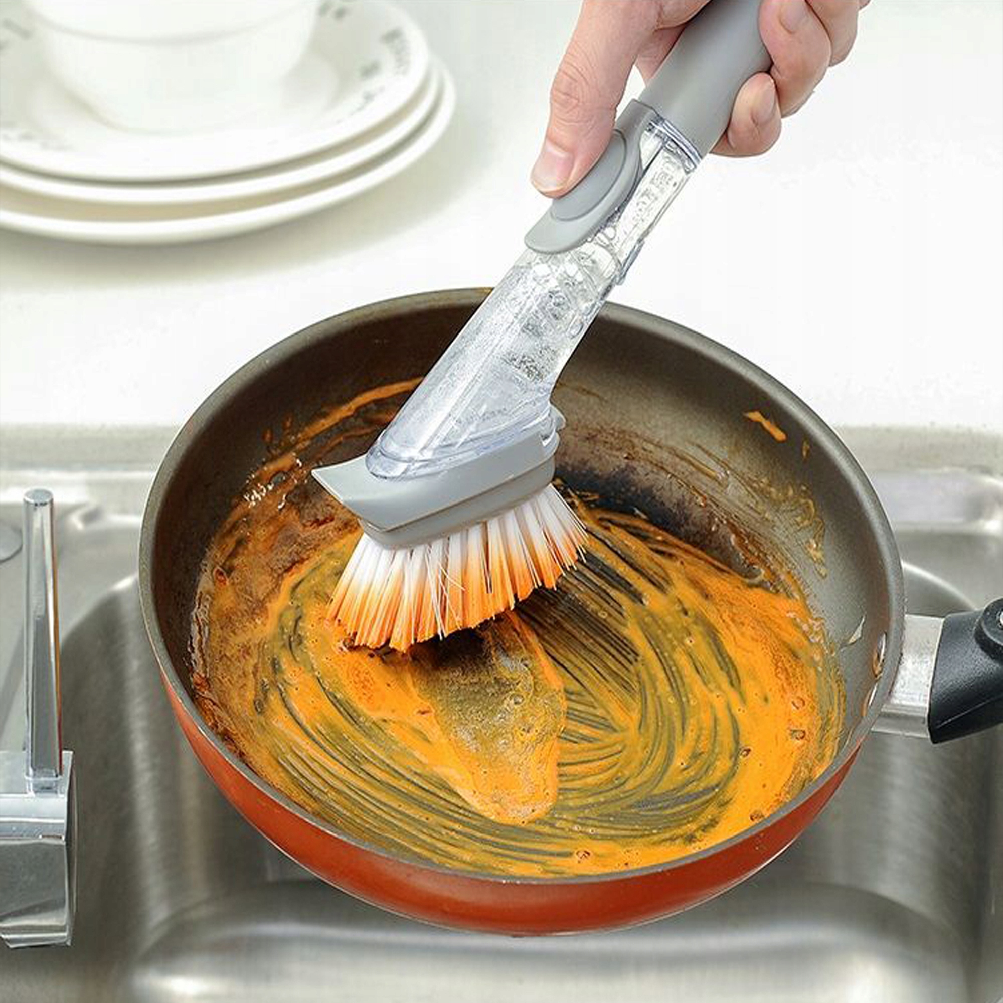 - Щетка с резервуаром для жидкости идеальна для кухни при чистке кастрюль и другой сильно загрязненной посуды.