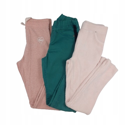 Джинсы (зеленые), спортивные штаны (розовые) и леггинсы.