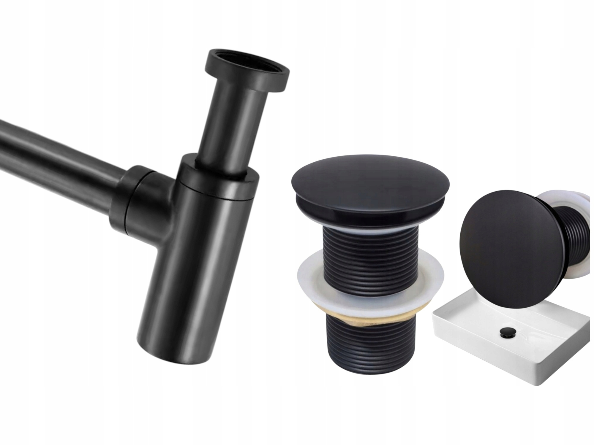 Идеальное решение для современных ванных комнат! Мы предлагаем качественный комплект, состоящий из сифона для умывальника и элегантной черной пробки «клик-клак» с переливом, который обеспечит не только функциональность, но и стильный внешний вид.