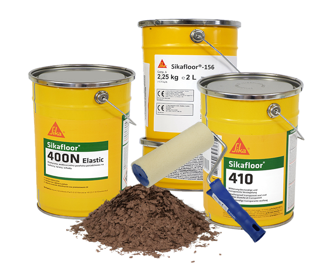 3. Sikafloor 400N (потребление около 0,3-0,5 кг/м2 с одним требуемым слоем-2 слоями) Op. Цвета 6 кг: Grey Ral 7032, Beige Ral 1001, Dark Grey Ral 7040, Graphite Ral 7024. Мы наносим первый слой с роликом (ролики также доступны в нашем предложении), мы наносим краску на весь горизонтальный бетонный пол, а также цвет плита на стенах, чтобы сделать запечатанный коврик на террасе или Балк. После сушки первого слоя (около 6 часов) мы применяем другой слой, пока не будет получен однородный выразительный цвет на всей поверхности. Вы можете дополнительно посыпать кварцевый песок на не скользите слой, чтобы получить не скользящий слой (кварцевый песок 0,4-0,8, доступный в нашем предложении) или так называемых декоративных хлопьев в разных цветах, чтобы улучшить эстетику покрытия.