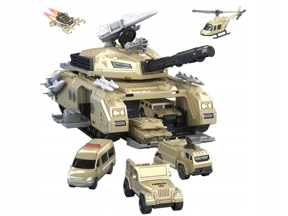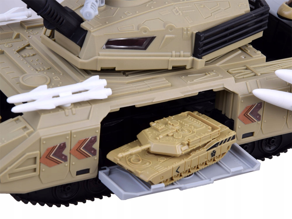 Реалистичный военный набор наверняка понравится каждому ребенку и подарит много часов незабываемого веселья. Танк-контейнер имеет 4 закрытых отсека для техники, солдат или вооружения, а его пушка вращается на 360 градусов.