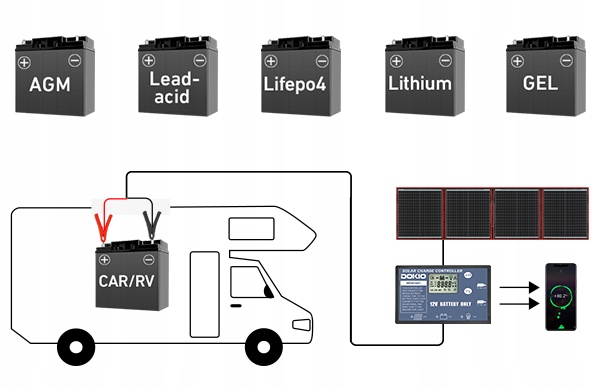 В комплект панели управления DOKIO входят устройства управления ШИМ 10 А, 12 В и кабели с зажимами типа «крокодил», специально предназначенные для зарядки свинцово-кислотных, литий-ионных и железо-фосфатных аккумуляторов, управляемых пользователями уровня управления.