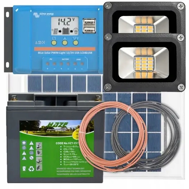 НАБОР СОЛНЕЧНОГО ОСВЕЩЕНИЯ СО СВЕТОДИОДАМИ-ГАЛОГЕНАМИ 10 Вт, СОЛНЕЧНОЙ ПАНЕЛИ 20 Вт, АККУМУЛЯТОРОМ 14 Ач и РЕГУЛЯТОРОМ ЗАРЯДКИ С ЖК-дисплеем VICTRON ENERGY 5 А, 12/24 В