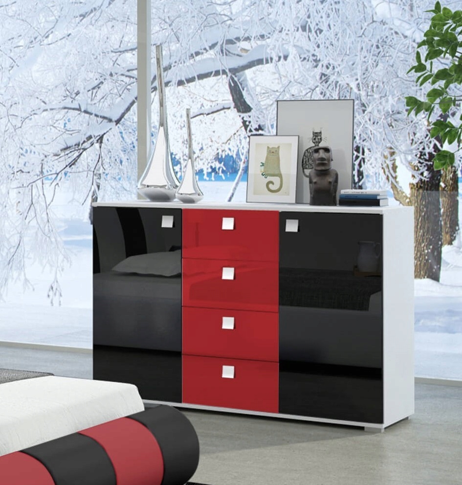 > ЧЕСТЕР- Комод из последней коллекции мебели для спальни. Корпус белого цвета, передняя часть с дверцами и ящиками глянцевого черного и красного цвета. Мебель прекрасно подойдет как для классического, так и для современного интерьера. Комод имеет вместительные выдвижные ящики, которые помогут поддерживать порядок в комнате и сэкономить место на другой мебели. Кроме того, он имеет практичные и декоративные ручки, придающие элегантный вид.