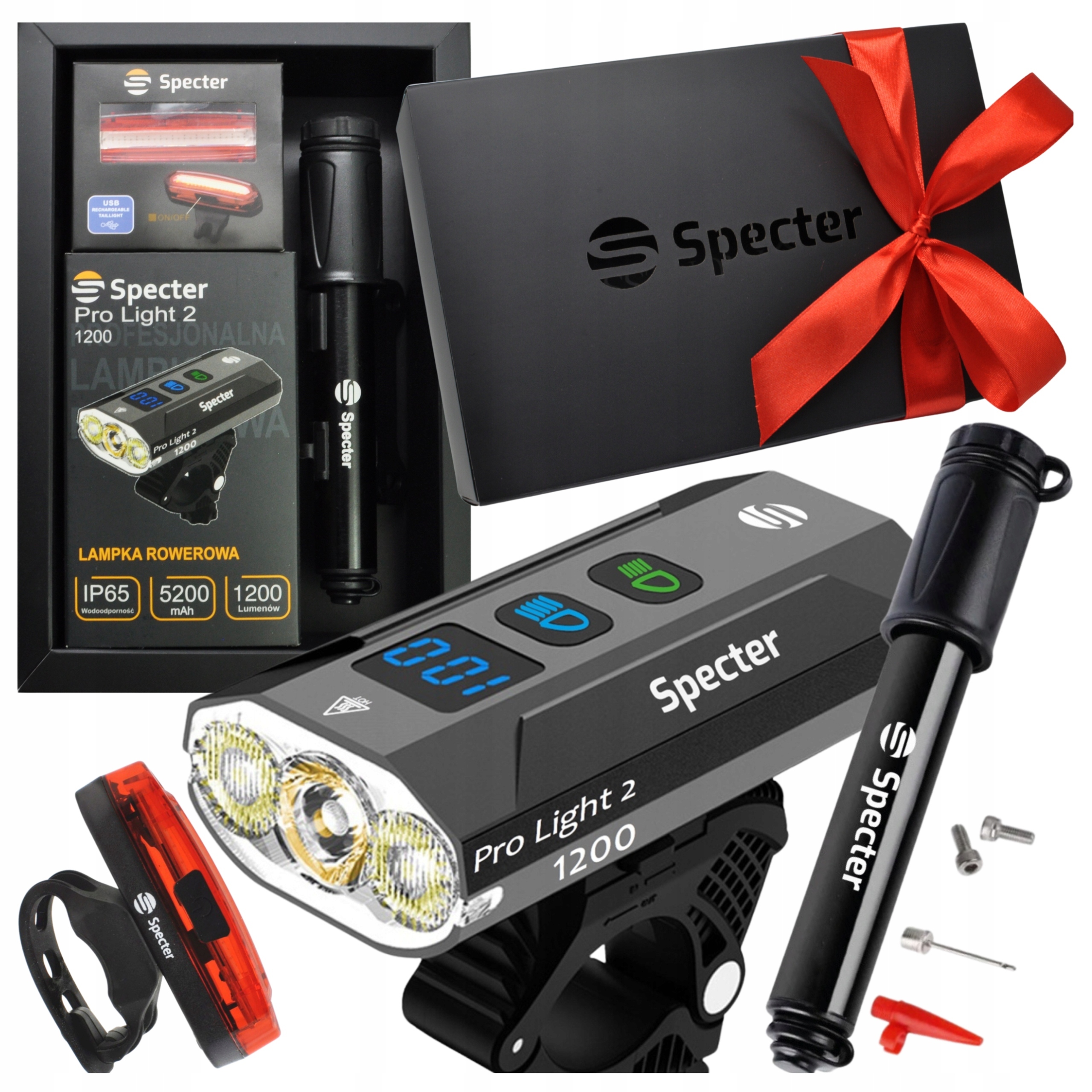 КОМПЛЕКТ ВЕЛОСИПЕДНЫХ ЛАМП SPECTER ПЕРЕДНИЙ ProLight2 + ЗАДНИЙ НАСОС AQY В ПОДАРОК
