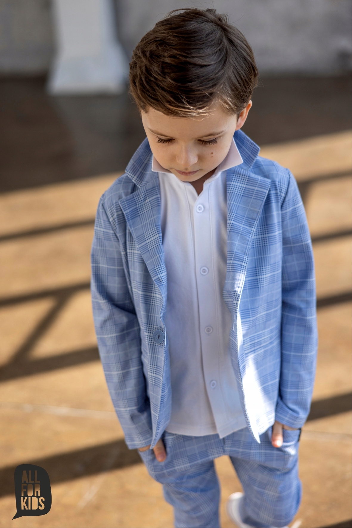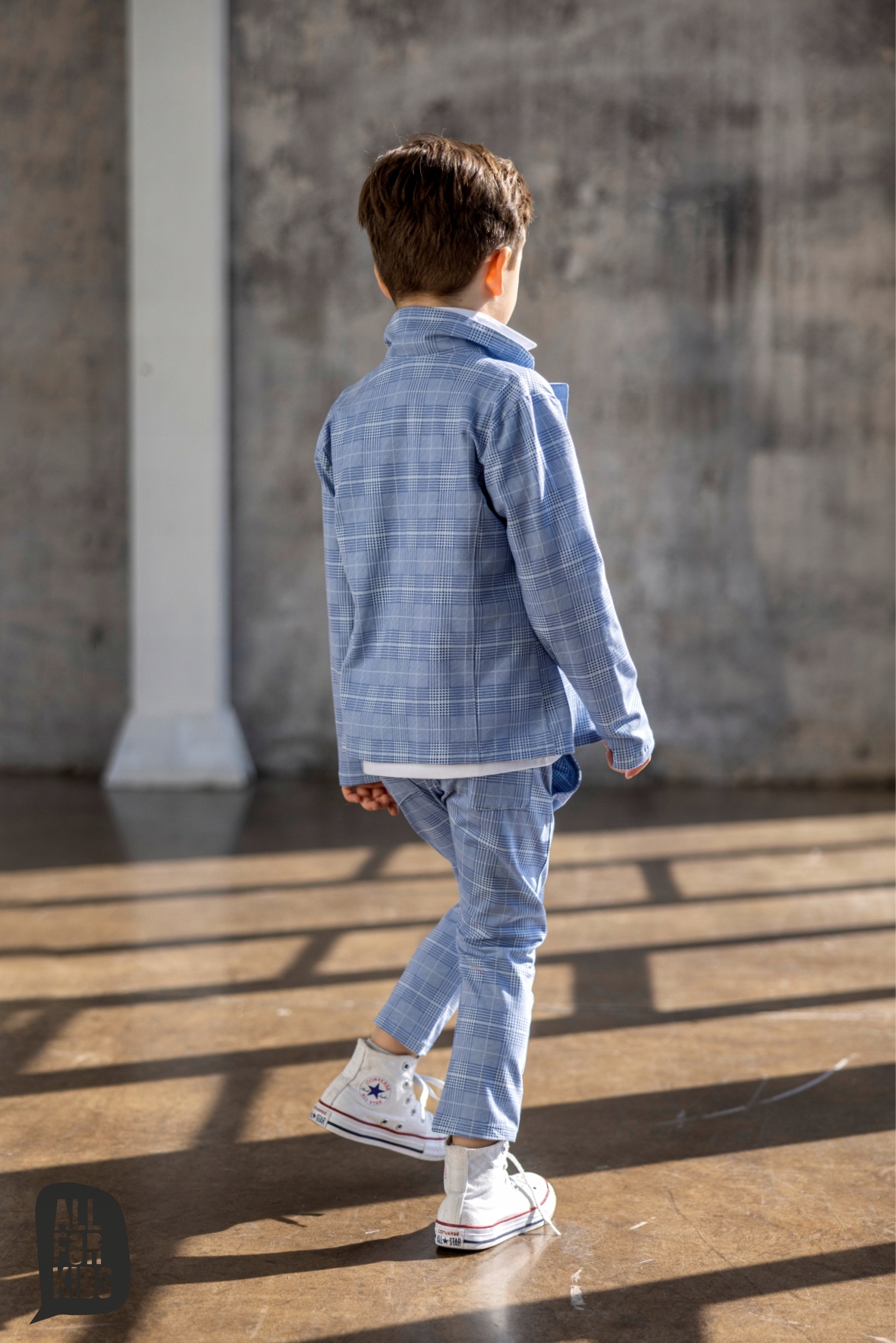 Элегантная куртка в клетку, застегивающаяся на одну пуговицу, и удобные брюки в клетку. , по талии на резинке, с ложной ширинкой и карманами.