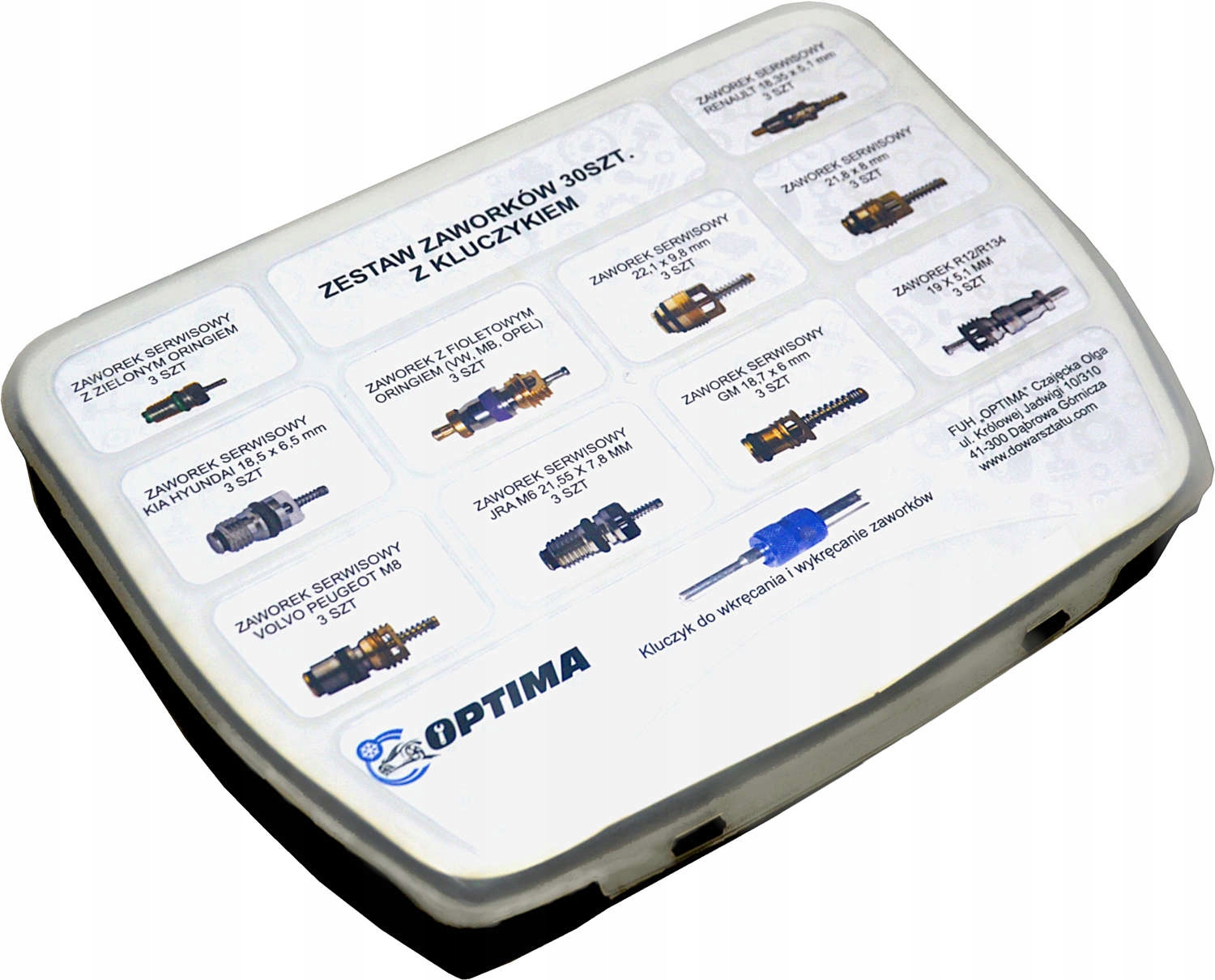 Незаменимы в каждой мастерской, занимающейся обслуживанием кондиционеров. В комплект входят 10 различных наиболее популярных клапанов, охватывающих практически весь рынок. СЕРВИСНЫЙ КЛАПАН С ЗЕЛЕНЫМ УПЛОТНИТЕЛЬНЫМ КОЛЬЦОМ 3 ШТ КЛАПАН СЕРВИСНЫЙ KIA HYUNDAI 18,5 x 6,5 мм 3 ШТ КЛАПАН PEUGEOT/VOLVO 3 ШТ КЛАПАН С ФИОЛЕТОВЫМ КОЛЬЦОМ (VW, MB, OPEL) 3 ШТ КЛАПАН JRA M6 21,55 x 7,8 мм 3 ШТ ВЫСОКАЯ КЛАПАН РАСХОДА M10 22,1 x 9,8 мм 3 ШТ. КЛАПАН GM ВЫСОКОГО РАСХОДА 18,7 x 6 мм 3 ШТ. СЕРВИСНЫЙ КЛАПАН RENAULT 18,35 x 5,1 мм 3 ШТ. КЛАПАН ВЫСОКОГО РАСХОДА M8 21,8 x 8 мм 3 ШТ. СТАНДАРТНЫЙ СЕРВИСНЫЙ КЛАПАН 19 x 5,1 мм 3 ШТ. КЛАПАН КЛЮЧ ДЛЯ СНЯТИЯ 1 ПК