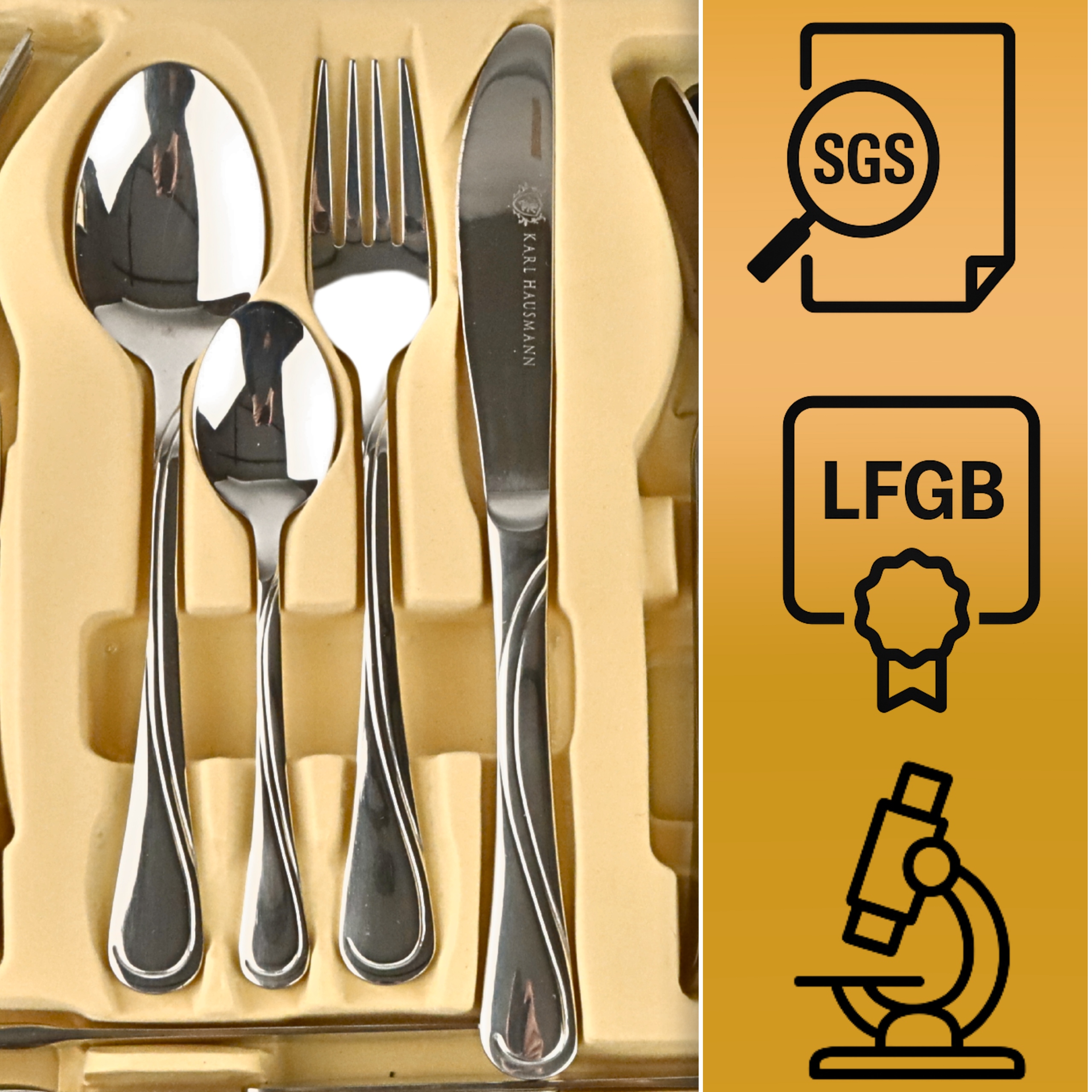 Бренд Karl Hausmann® уже много лет пользуется доверием покупателей по всей Европе — благодаря стабильному качеству, добротному мастерству и строгим лабораторным испытаниям. Столовые приборы изготовлены из высококачественной нержавеющей стали 18/0 без добавления никеля, что повышает их устойчивость к ржавчине и царапинам. Каждый комплект представляет собой сочетание точного производства в соответствии со стандартами ISO, сертификатами SGS и LFGB, а также эстетичным, неподвластным времени дизайном.