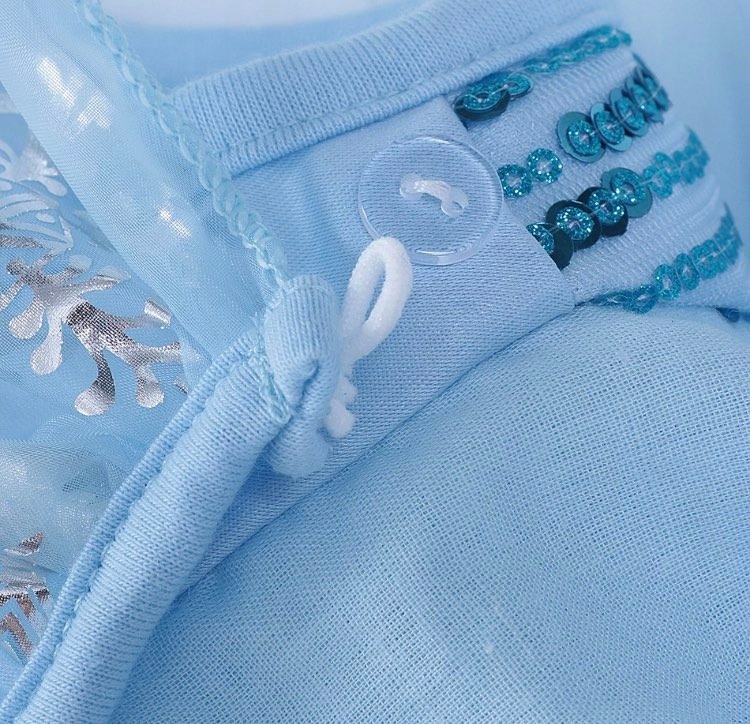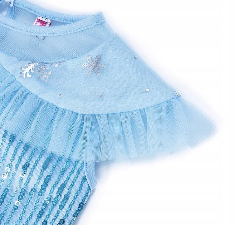Красивое, сверкающее платье, корсет, расшитый кристаллами, прикрепленный шлейф, сверкающий серебряными снежинками. Шлейф прикрепляется к платью отдельно на пуговицах. Низ платья полностью из тюля, вдохновленный морозной принцессой Эльзой. Двухслойный низ состоит из тюля и подкладки.