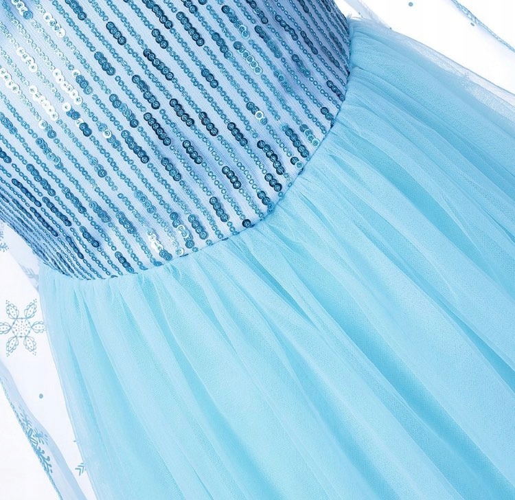 Красивое, сверкающее платье, корсет, расшитый кристаллами, прикрепленный шлейф, сверкающий серебряными снежинками. Шлейф прикрепляется к платью отдельно на пуговицах. Низ платья полностью из тюля, вдохновленный морозной принцессой Эльзой. Двухслойный низ состоит из тюля и подкладки.
