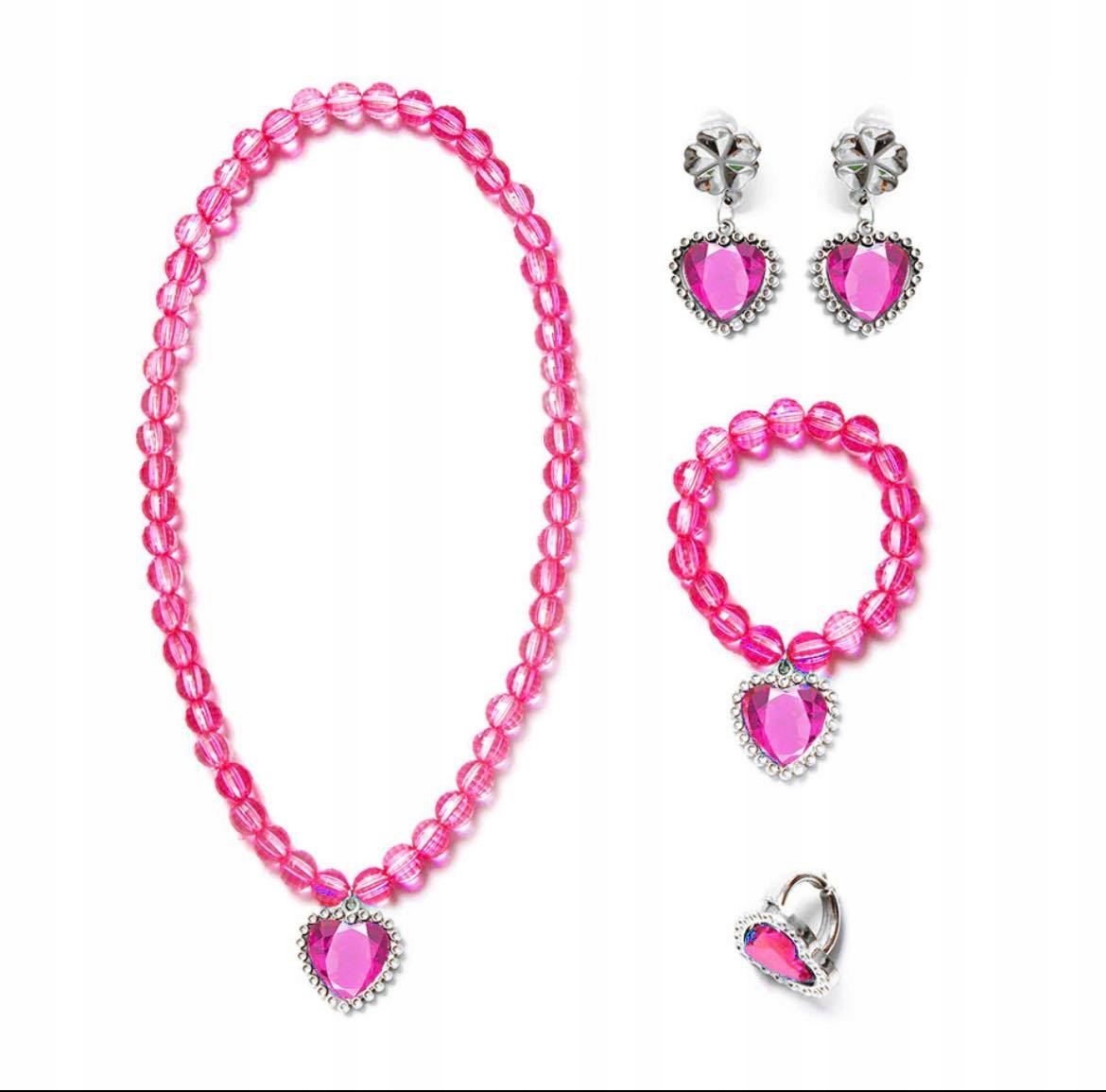 - Колье: Эластичные розовые бусины с хрустальным сердцем.
