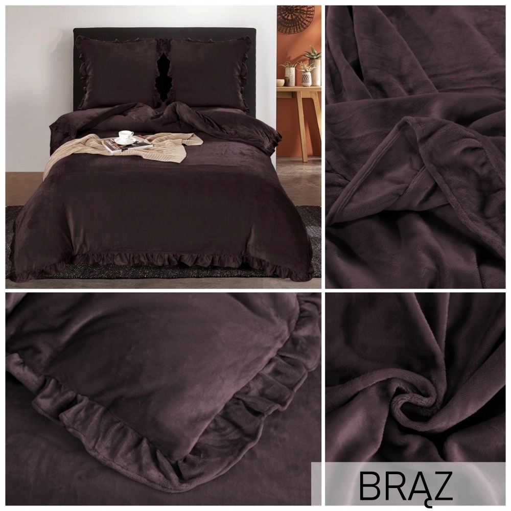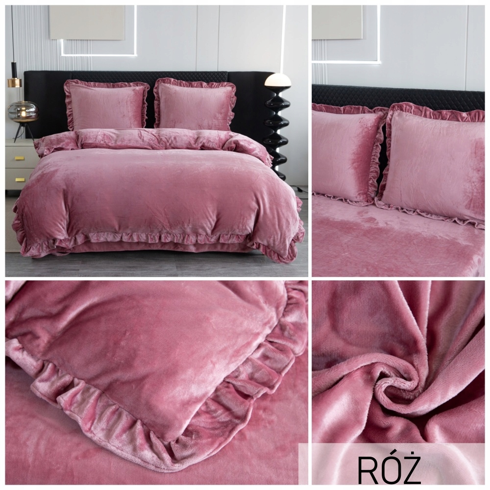 - Комплект постельного белья выполнен из бархатного материала, отделанного рюшами.