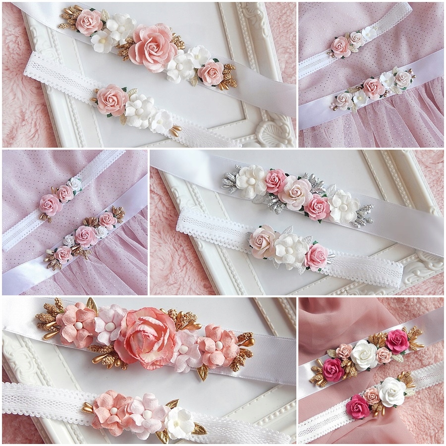 Пояс для платья "Роза" из белой атласной ленты длиной 120 см. украшен красивыми цветами.
