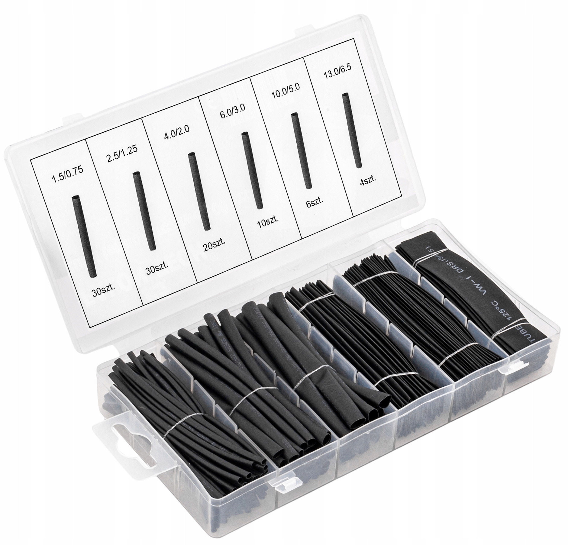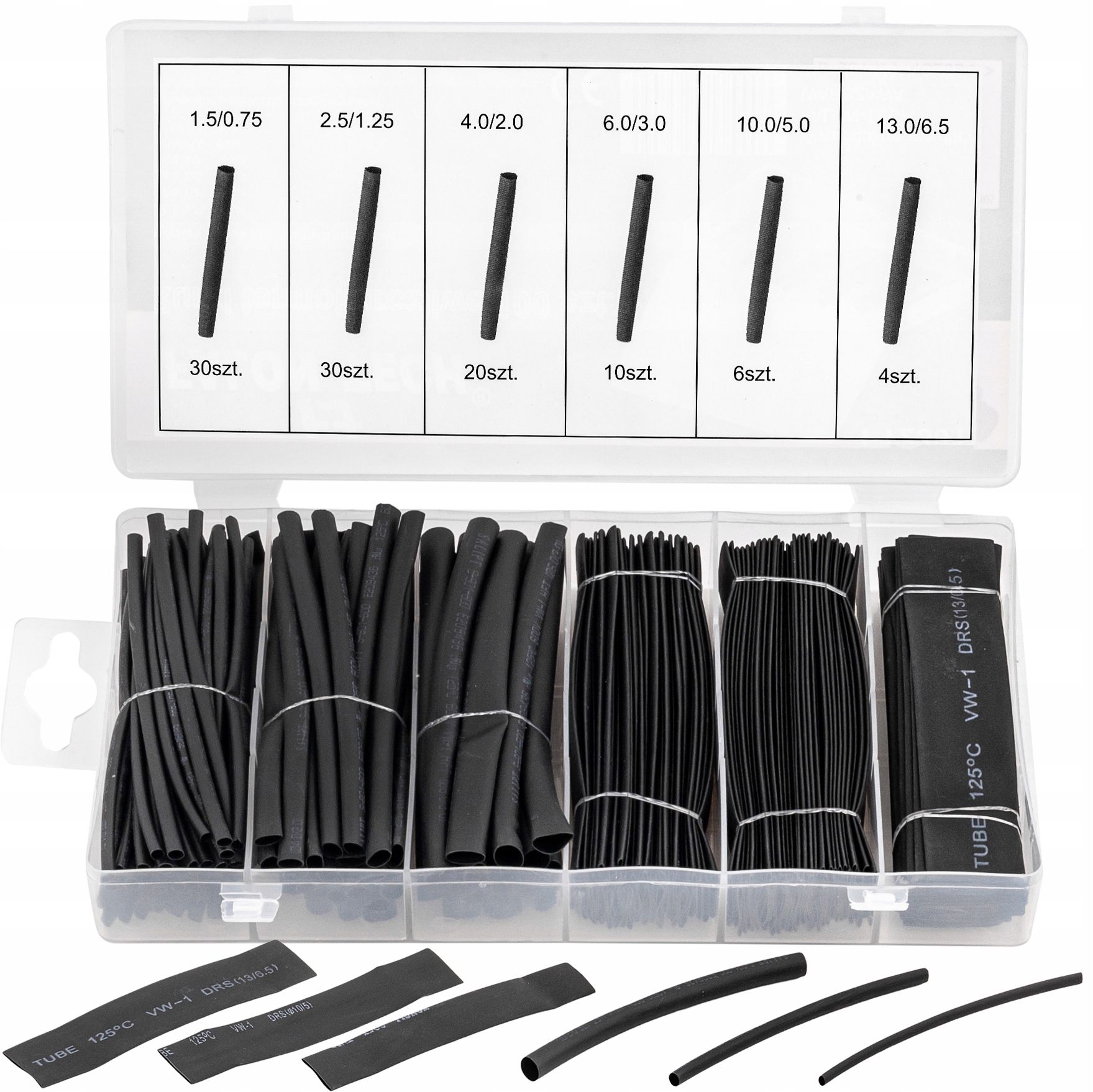 В комплект входит 127 штук термоусадочных трубок 7 популярных размеров.