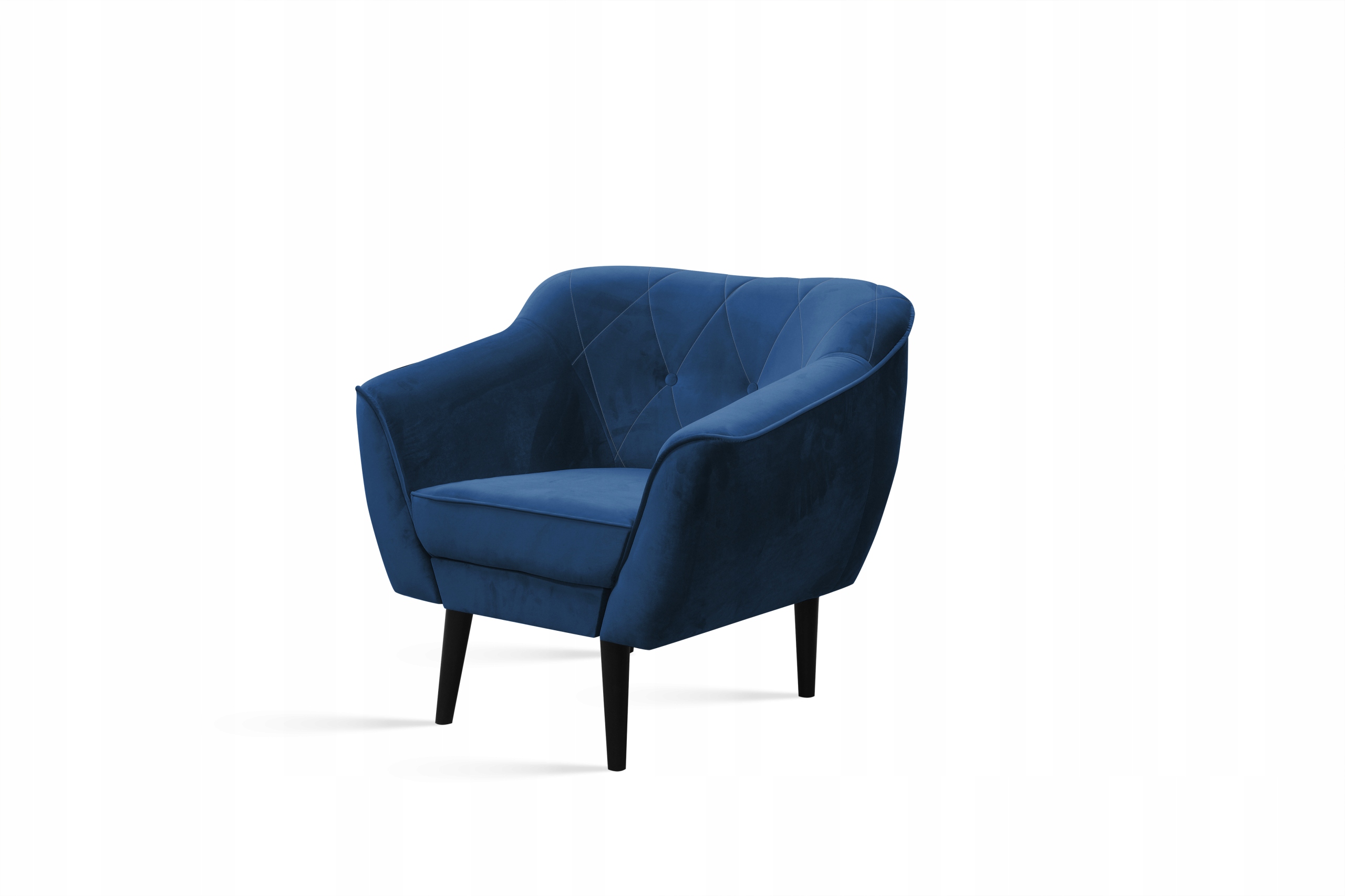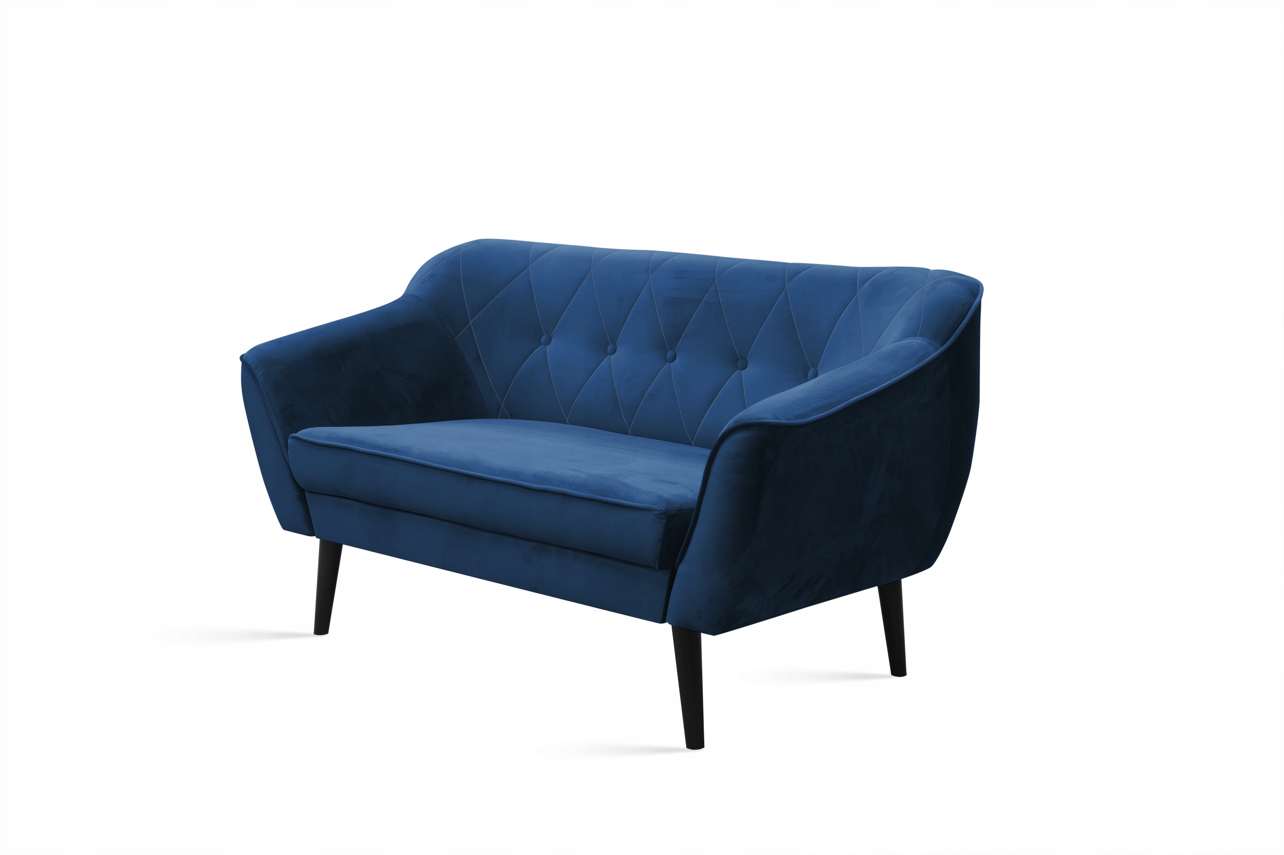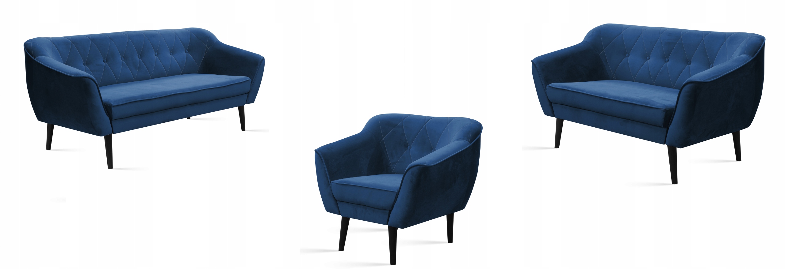 ТВЕРДЫЙ ДИВАН 3 + 2 + 1 СИНЕГО ЦВЕТА С ДЕРЕВЯННЫМИ ЧЕРНЫМИ НОЖКАМИ, СТЕГАНЫЙ УЗОР СПИНКИ, КНОПКИ KARO