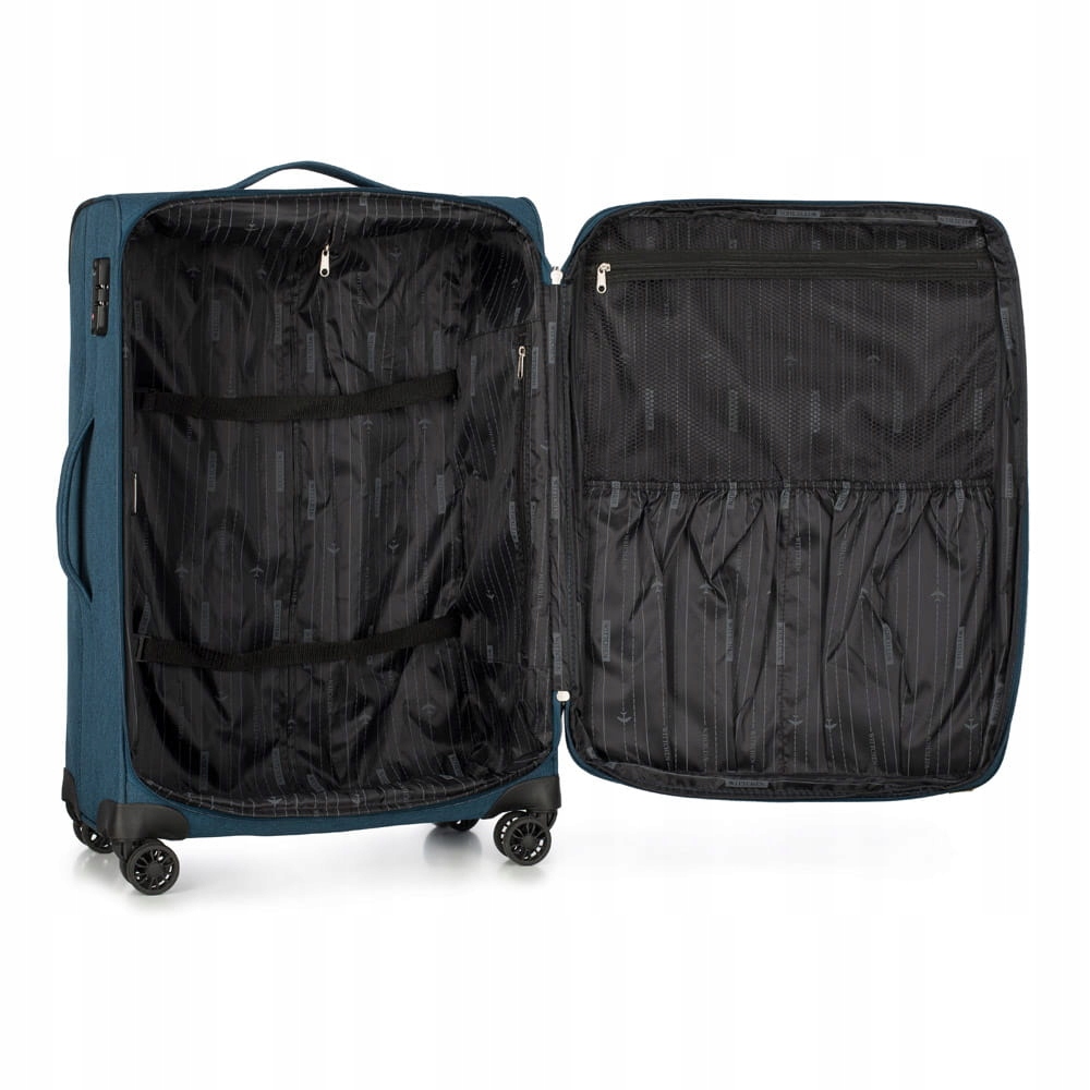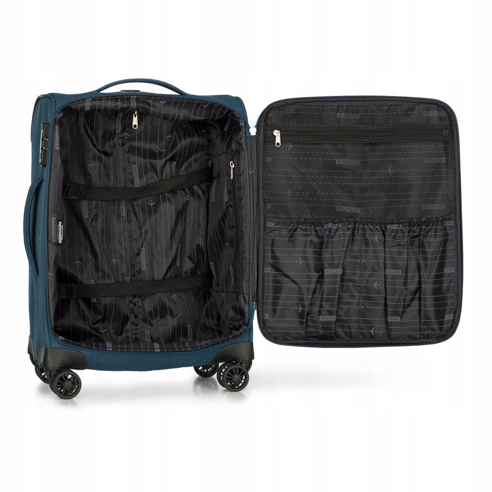 Набор мягких чемоданов WITTCHEN 56-3S-50S-91 от Коллекция Comfort Line II изготовлена из прочного полиэстера темно-синего цвета. Каждый чемодан оснащен четырьмя колесами для облегчения перемещения багажа, выдвижной алюминиевой ручкой, дополнительными ручками и идентификатором, позволяющим маркировать чемодан своими личными данными. Внутри чемоданы имеют основное отделение с регулируемыми ремнями, предотвращающими перемещение багажа, 2 кармана на молнии, в том числе один сетчатый, и 2 открытых кармана. Большим преимуществом этой модели является очень функциональный и просторный салон, который значительно упрощает упаковку. Чемоданы также имеют встроенную молнию, позволяющую расширить их на 3 см. Кроме того, снаружи имеются 4 дополнительных кармана на молнии для полезных в путешествии аксессуаров, которые всегда стоит иметь под рукой. Преимуществом чемоданов является безопасность в виде замка TSA, благодаря которому при досмотре багажа таможенными службами мы можем гарантировать неинвазивное открытие чемодана и его повторное закрытие, не повреждая замок.