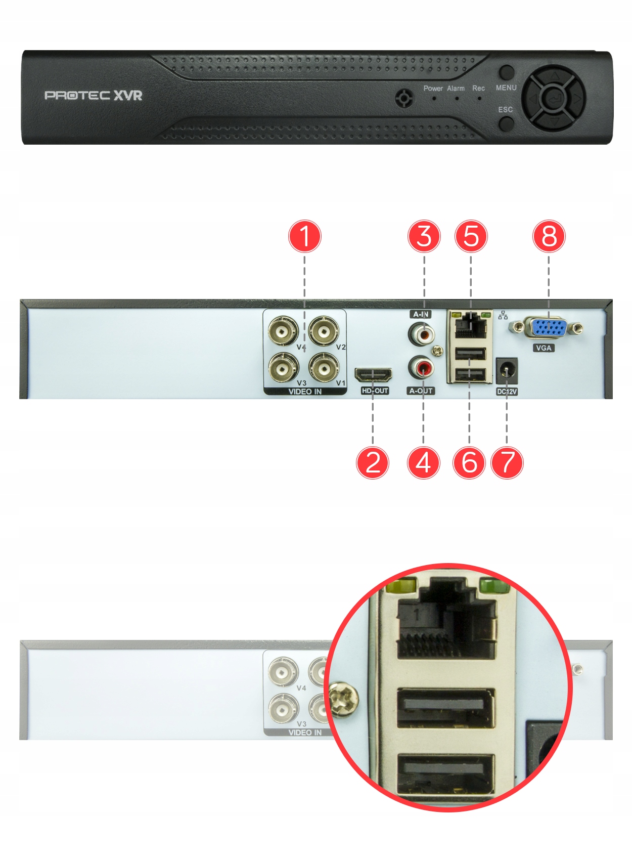 USB-разъемы позволяют удобно подключать мышь для управления рекордером (USB-мышь в комплекте), а также одновременно подключать портативное запоминающее устройство для загрузки записей с камер.
