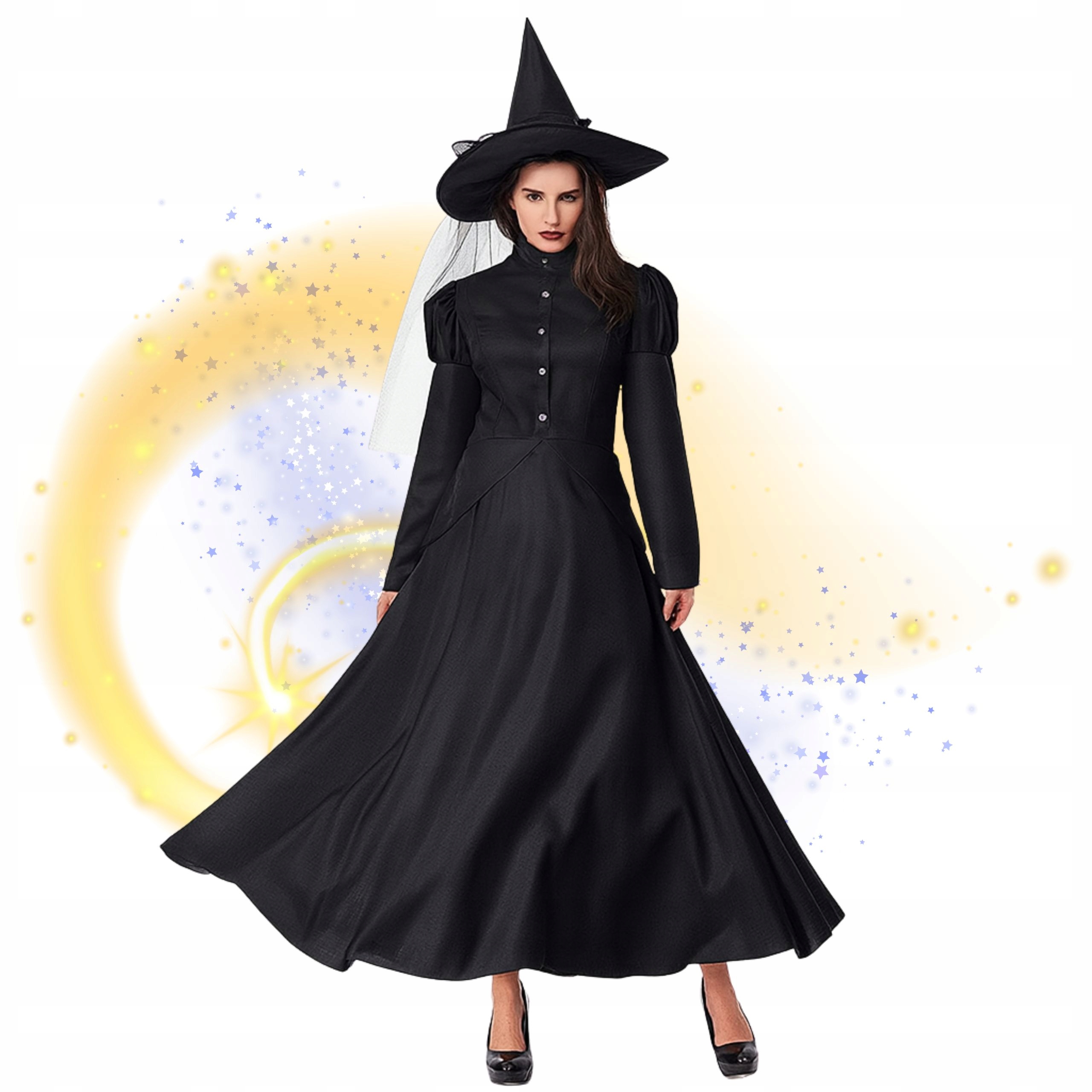 Этот элегантный костюм ведьмы представляет собой сочетание классического и современного стиля, созданный для особых случаев. Длинное черное платье слегка расклешенного кроя красиво драпируется при движении, а высокий воротник и ряд декоративных пуговиц подчеркивают его изысканный, почти викторианский характер.