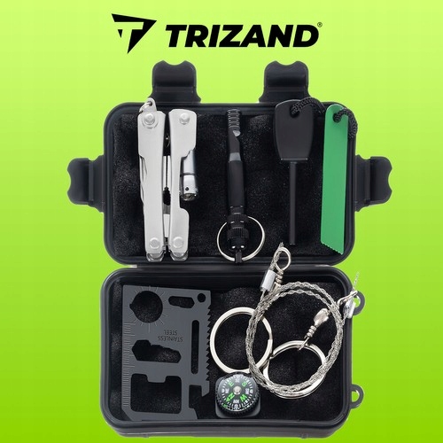 7 в 1 - в набор входит карта выживания 11 в 1, компас, мультитул, струнная пила длиной 70 см, зажигалка со стержнем на веревке, герметичный контейнер со свистком, в который можно спрятать что-нибудь маленькое, и наклейка с предупреждениями.