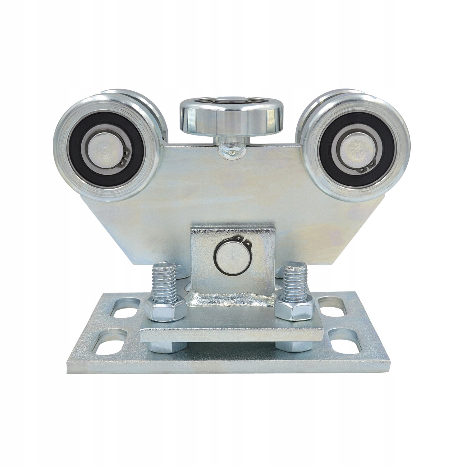 Подвижная тележка (две шт.) с 5 металлическими роликами (включая один горизонтальный ролик). Тележка качающаяся и адаптируется к откатным воротам (соединяется с основанием штифтом). Он также регулируется по высоте с помощью винтов. Он рассчитан на рейку 70x70x4 мм. Изделие оцинкованное.