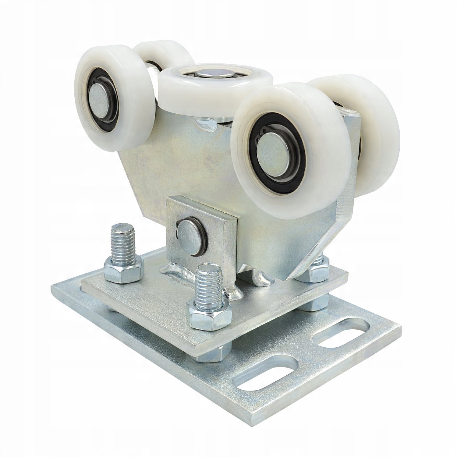 Тележка (две штуки) с 5 роликами из полиамида (включая один горизонтальный ролик). Тележка качающаяся и адаптируется к откатным воротам (соединяется с основанием штифтом). Он также регулируется по высоте с помощью винтов. Он рассчитан на рейку 70x70x4 мм. Изделие оцинкованное.
