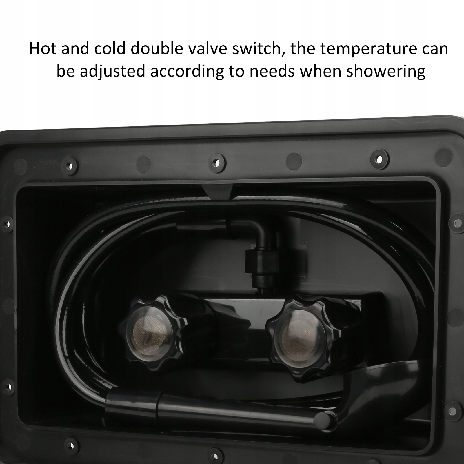 1. Изготовлен из инженерного АБС-материала, обладает хорошей устойчивостью к старению, пожелтению и ударам. 2. Двойной переключатель клапана горячей и холодной воды. Во время купания температуру можно регулировать в соответствии с вашими потребностями. 3. С замком, который можно запирать, когда он не используется, и снимать, когда он используется, что значительно повышает безопасность и защищает интерьер. 4. Обеспечивает быстрое и простое решение для принятия душа во время активного отдыха. 5, прочный и долговечный, имеет длительный срок службы, подходит для кемпинга, морской лодки, пикника и т. д.