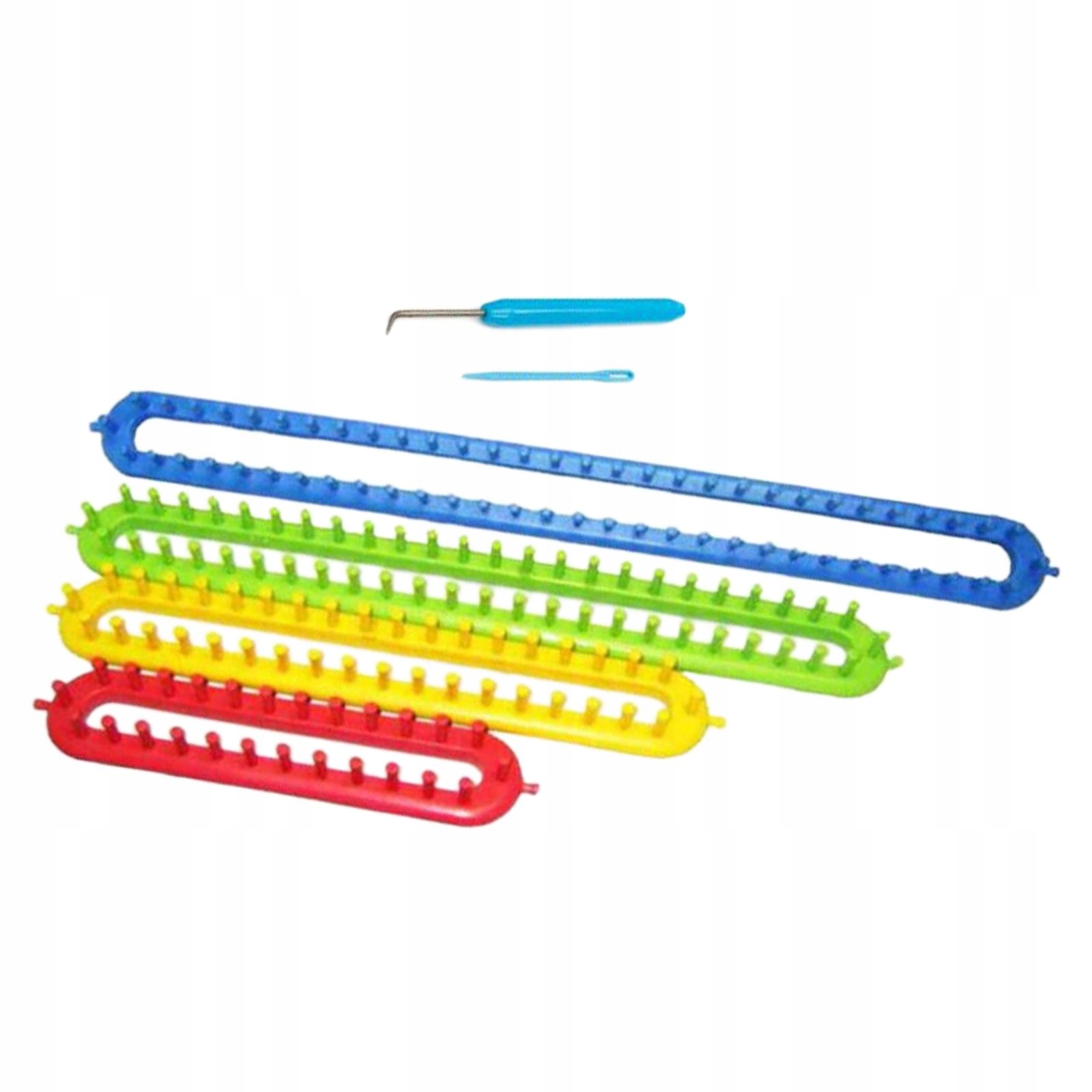В комплект входят 4 ткацких станка от короткого до длинного размера, 1 спица, одна игла для вязания крючком, 1 инструкция.