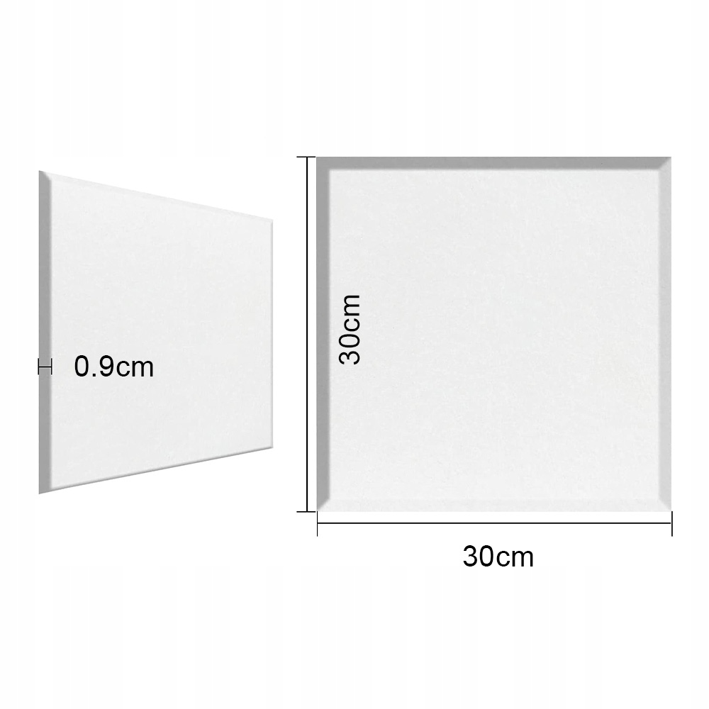 Каждая упаковка из 12 квадратных акустических панелей имеет размеры 30 x 30 x 0,9 см и имеет плоский срез заподлицо со скошенными краями для облегчения установки. Их можно разрезать по размеру и форме стен или дверей. Самоклеящийся слой упрощает монтаж и не требует использования каких-либо специальных инструментов или оборудования.