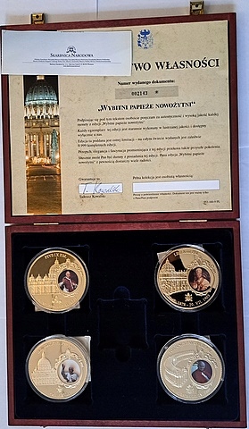 - НАБОР ИЗ 4 ПАПСКИХ МЕДАЛЕЙ «ВЫДАЮЩИЕСЯ СОВРЕМЕННЫЕ ПАПЫ» В ДЕРЕВЯННОЙ КАССЕТЕ - фото